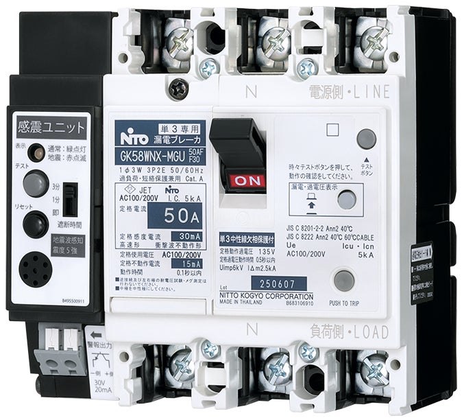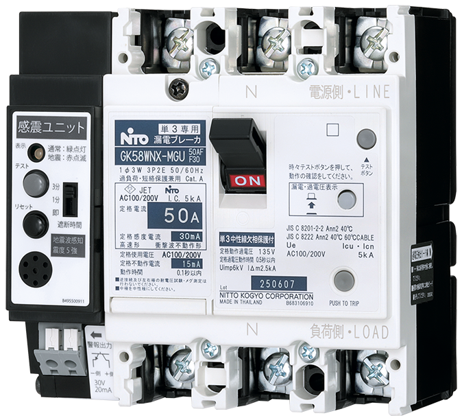 日東工業の感震ブレーカーは震度5強相当以上の揺れを感知すると、設定された時間(3分、1分、即時)経過後に自動的に遮断します。