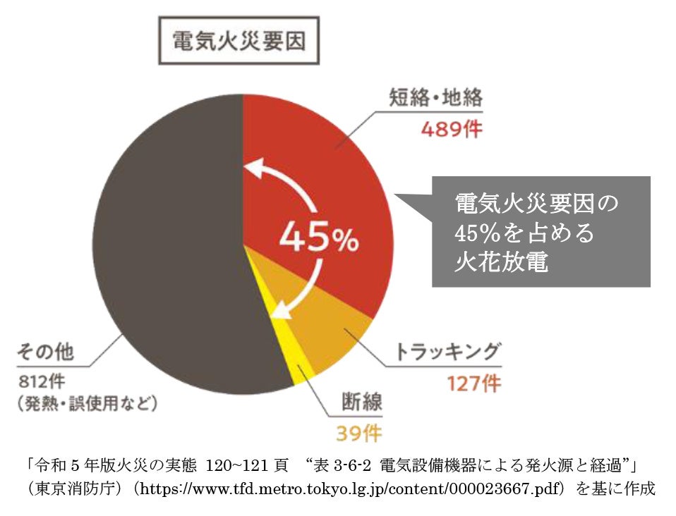 電気火災要因の約45%を占めるのは、トラッキング現象やケーブルの劣化・損傷に起因する「火花放電」です。従来からの保護機器である漏電ブレーカーは短絡・地絡や過電流が発生すると電気を遮断しますが、火災の原因となり得る火花放電の検出には対応していません。日東工業の「放電検出ユニット」は、この火花放電を早期に検出し、火災を未然に防ぐ日本初の画期的な商品です。