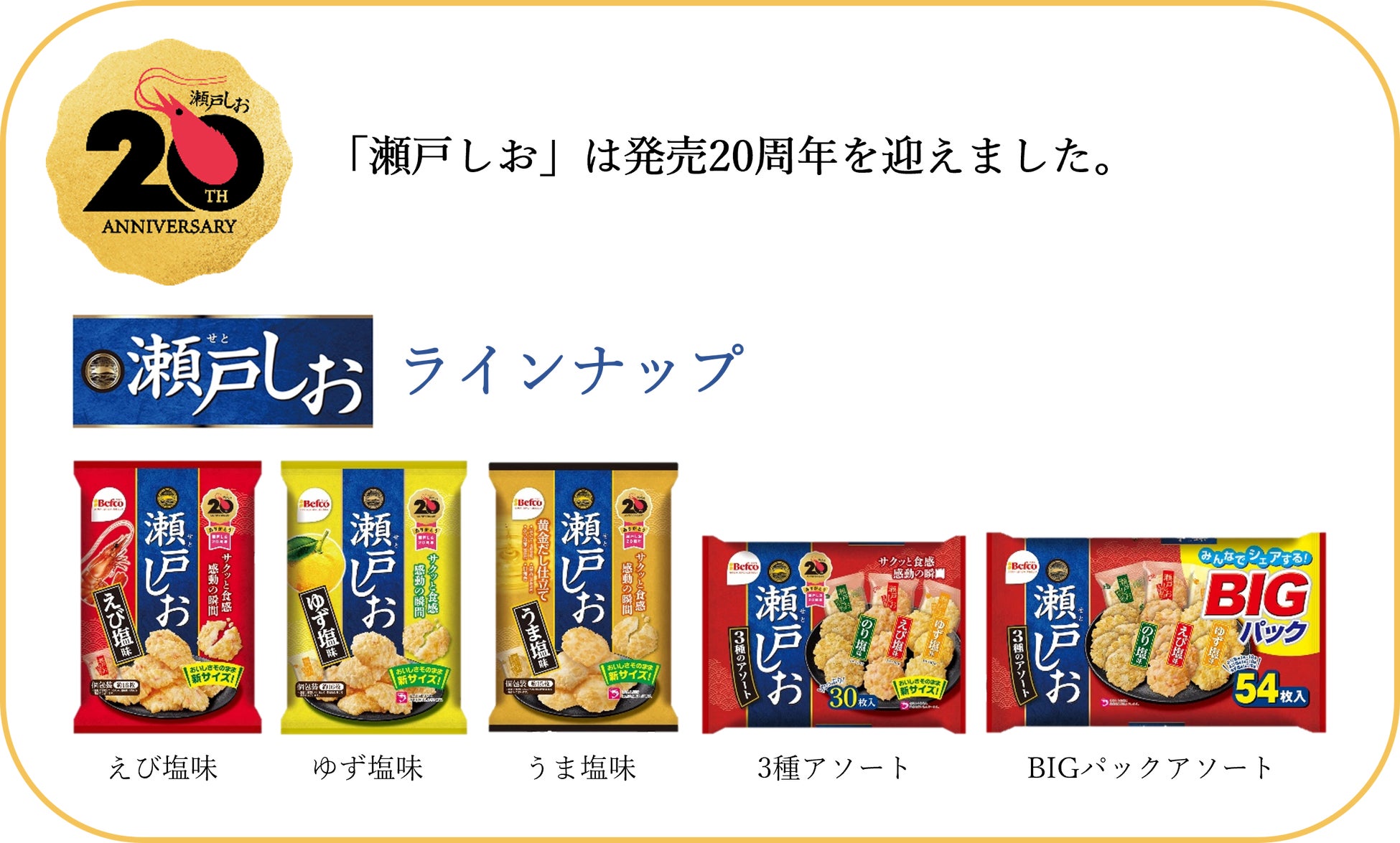 主要商品 「ばかうけ」「瀬戸しお」「星たべよ」など