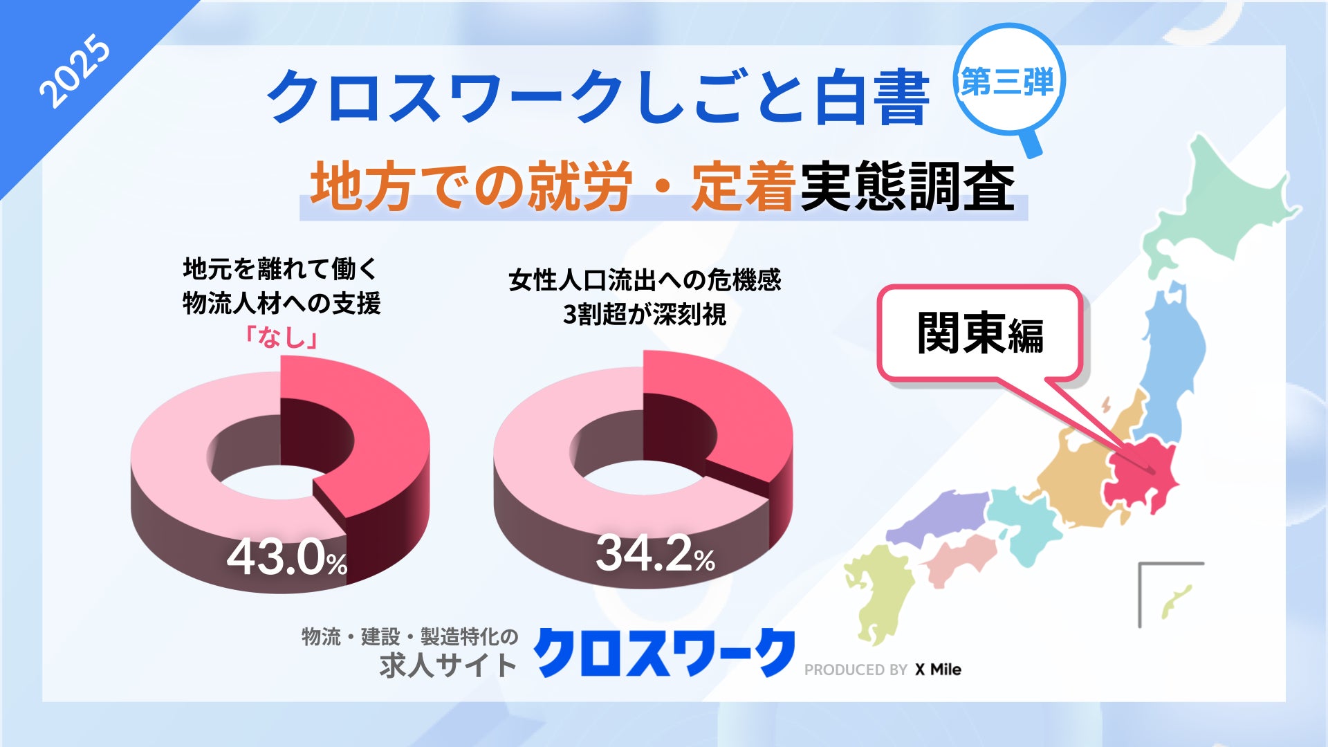 ノンデスク事業者向けの人材採用システム『クロスワーク』を提供するX Mile株式会社(読み:クロスマイル、本社:東京都新宿区、代表取締役:野呂 寛之、以下『当社』)は、物流業界の働き方に関する実態調査「クロスワークしごと白書2025」の第三弾として、『地方での就労・定着』に関する独自調査を実施しました。本調査の中から、関東地方の物流業界の現状に着目したところ、地元から離れて働く人材や未経験者向けの支援状況や、女性の地元離れへの課題意識の実態が明らかになりました。