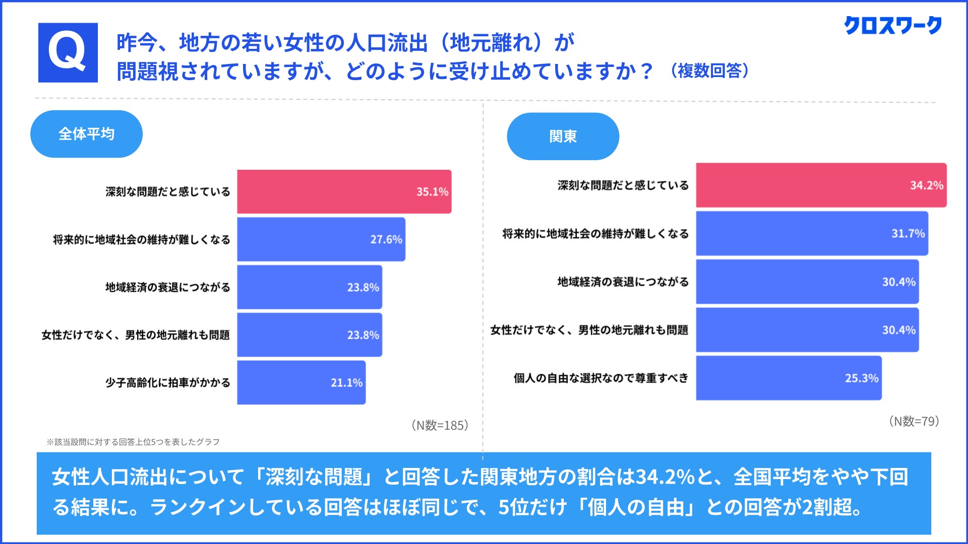 関東地方では、地方の女性人口流出に対して「深刻な問題だと感じている」が34.2%と、全国平均の35.1%とほぼ同水準の認識を持っていることが明らかになりました。