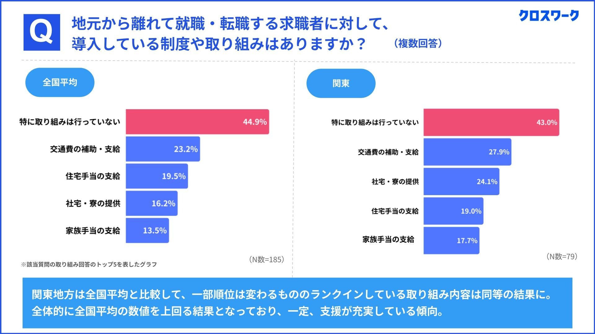 具体的な取り組みにおいても、全国版との比較で一部順位は変わるものの、全国平均でランクインしている「交通費の補助・支給」「社宅・寮の提供」などが上位に挙がっています。
