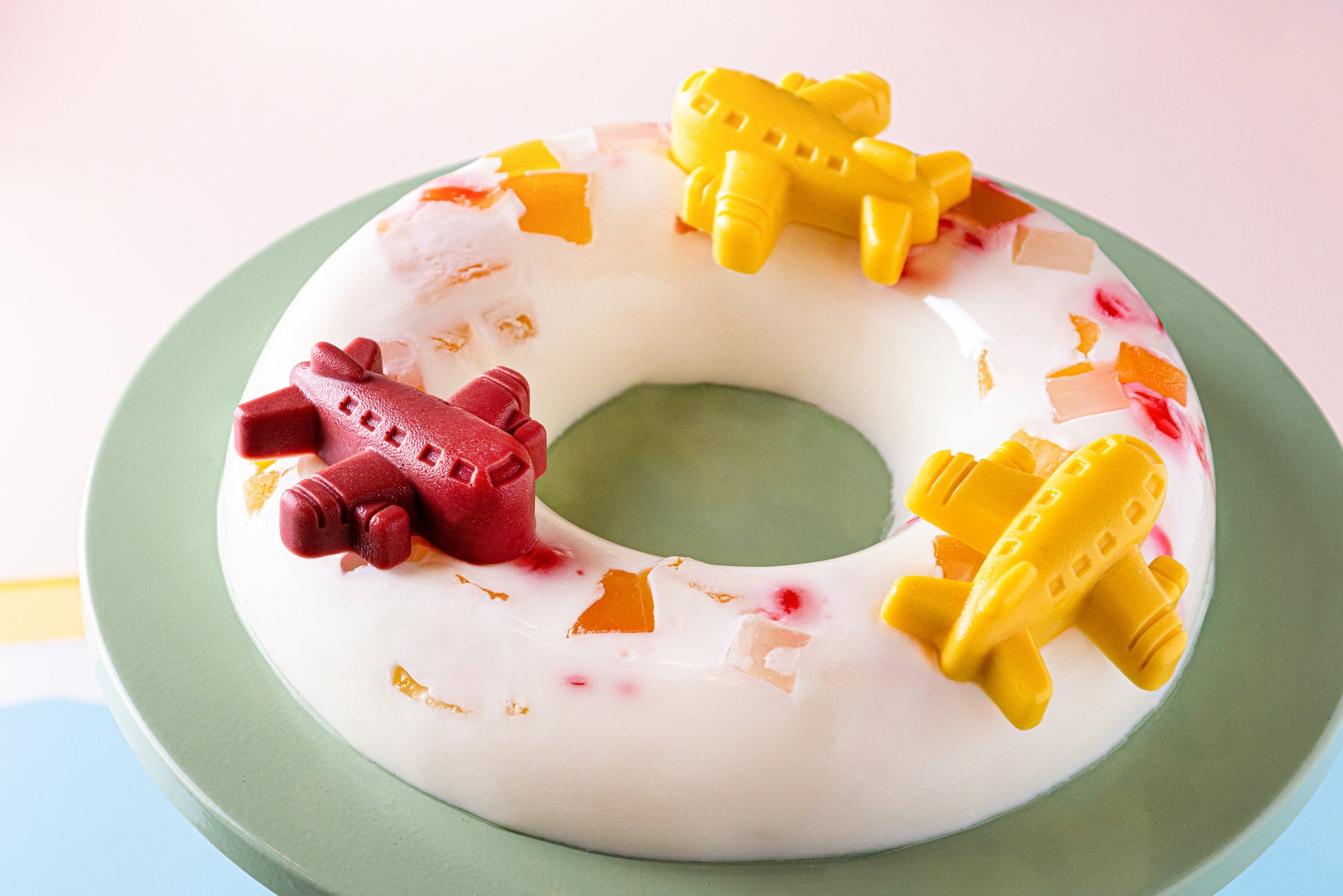 チェリーやパイナップルなどのキャンディフルーツをミルクババロアで包み飛行機を象ったチョコレートを添えました。