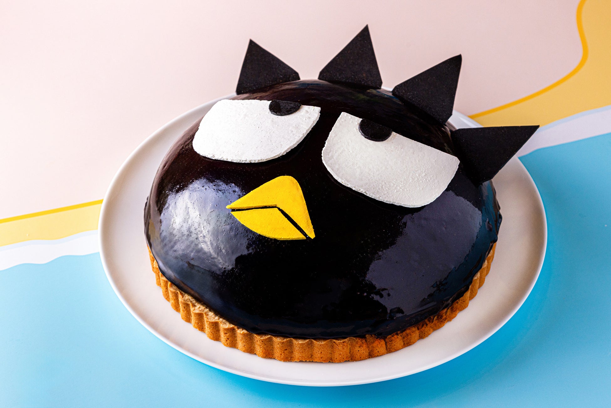 バッドばつ丸へのサプライズケーキをイメージ。チェリーのコンフィをチョコレートムースで覆いタルトの上に重ねました。