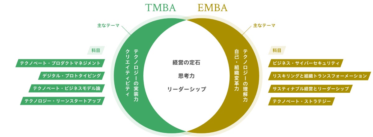 昨今、AIやテクノロジーの進化など過去に例を見ないほど激しくなっています。同時にMZ世代の価値観の変化、キャリアの選択肢の増加、人生100年時代におけるリスキリングのニーズの高まりを背景に、ビジネスを学ぶ目的も多様化しています。多様な学びのニーズに対応するため、グロービス経営大学院は2025年度より従来のMBAプログラムを「テクノベートMBA(TMBA)」「エグゼクティブMBA(EMBA)」の2つのプログラムに分けて開講しました。「TMBA」は、テクノロジーをビジネスに実装するための力を、「EMBA」は経営をリードするための力を身に付けたいというニーズに応えます。