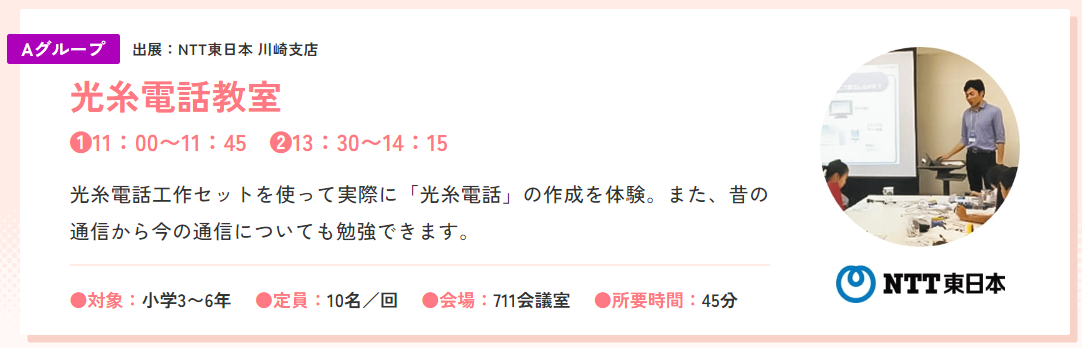 東日本電信電話株式会社 川崎支店(川崎支店長:立野 恭伸、以下「NTT東日本 川崎支店」)は、「子供たちが科学やものづくりを体験的に学べる総合イベント」として開催された「第17回・かわさきサイエンスチャレンジ」において、「光糸電話教室」のブース出展協力をしました。
