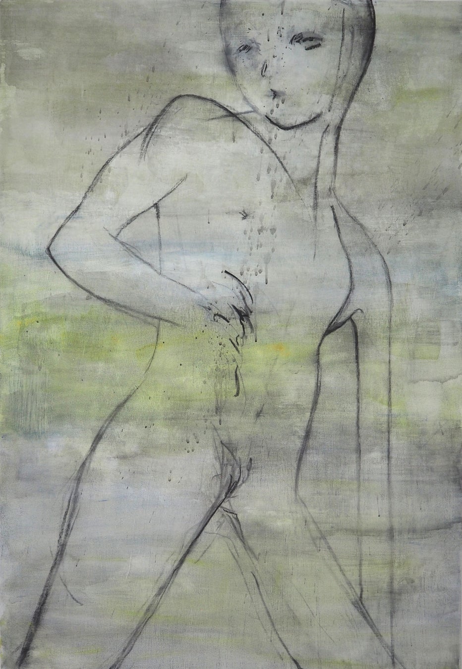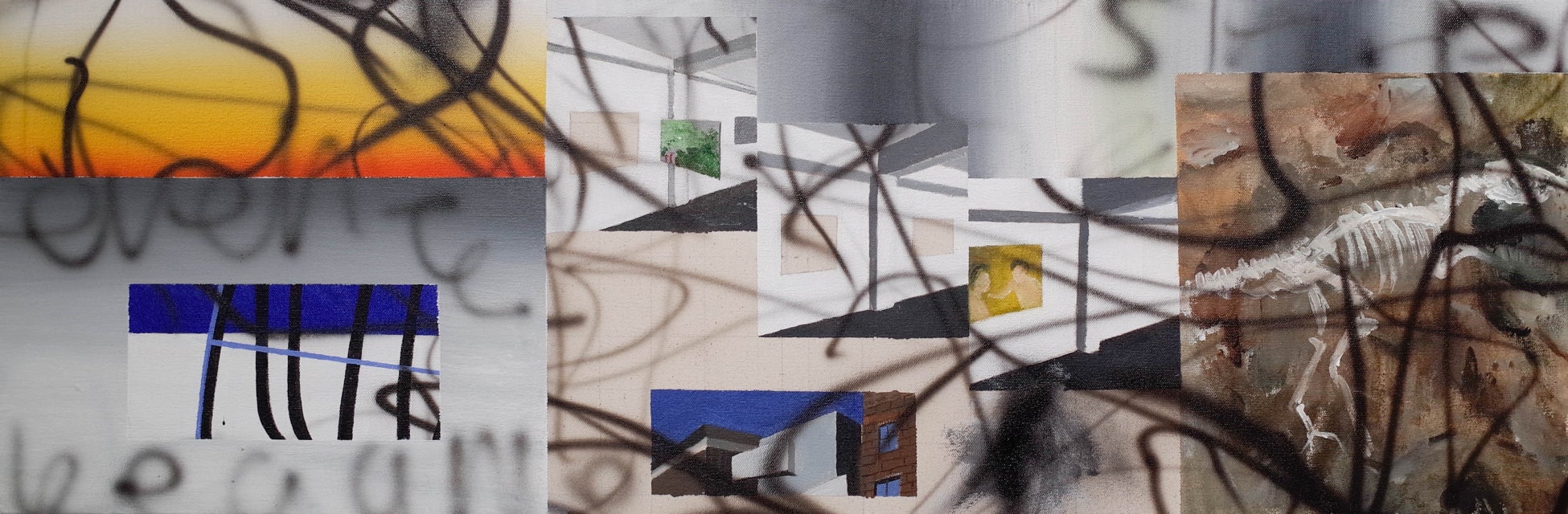 現代における絵画を試行する。画面に触れることなく絵の具を定着させ、途切れることなく線を引き続けることが可能なエアブラシを描画道具などに用いる。都市の記号である文字、建築、景色などをモチーフに用い、複数の時間と視点を持った流動的な絵画空間を構築する。