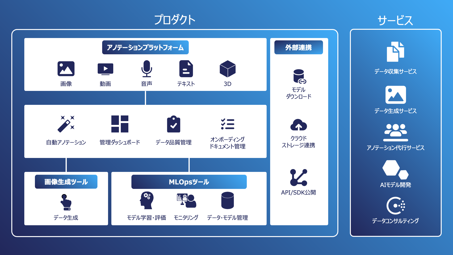 事業内容:データ販売・収集、データ生成、アノテーション、モデル開発、データコンサルティングに関するサービス提供、並びに画像生成AIツール、マスキングツール、アノテーションツール、MLOpsツールの提供