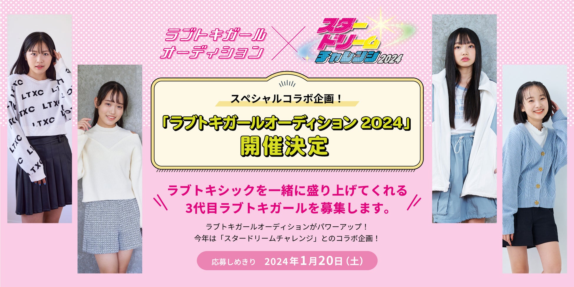 今年の「ラブトキガールオーディション」は、最大級スカウトオーディション「スター☆ドリームチャレンジ2024」とのコラボ企画。今年のラブトキガールは、大型ライブ会場のランウェイでデビューします!