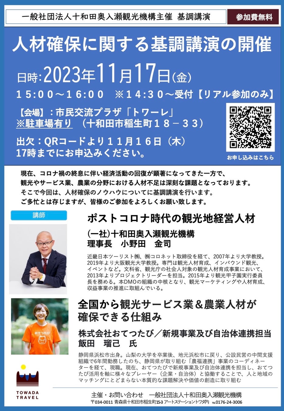 (一社)十和田奥入瀬観光機構では今般、「人材確保」をテーマとした基調講演の開催を下記の通り予定しておりますので、ご案内いたします。