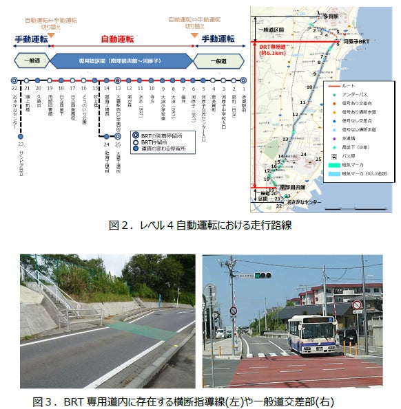 今回、特定自動運行を実施するBRT専用道区間には、バス停が14箇所、一般道との交差部が11箇所、横断指導線(歩行者等の横断部)が15箇所(バス停に9箇所、走行路線上に6箇所)含まれています(図2、図3)。また、車道と歩道の間にガードレール等がある場所や縁石のみで仕切られている場所が混在するうえ、手動運転バス車両とのすれ違いなど、さまざまな走行環境が含まれます。