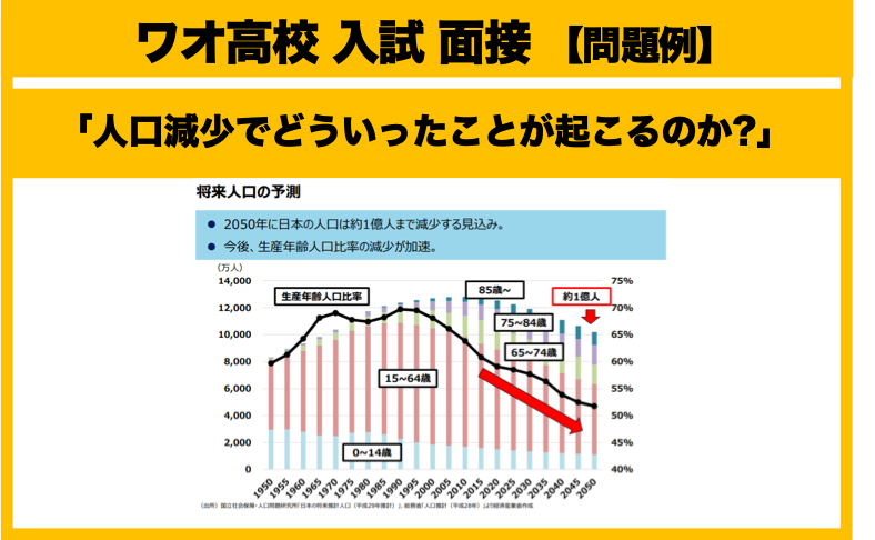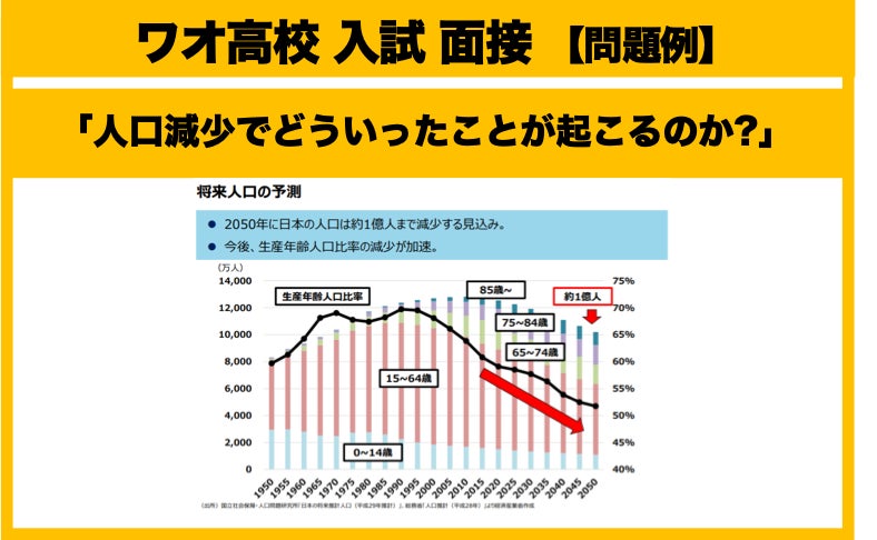 2024年度新入学の入試については、①哲学的な思考を問う問題 ②科学または経済に関する問題の出題に決定いたしました。「自分の主観のみでの回答」、「自分以外の考えをもとに自分の考えを回答」、「普遍的な事実に基づき客観的に回答」で得点化をしていきます。教養探究を学ぶワオ高校への適性を、入試を通して対話をしながら見極めていきます。今回、面接入試の中で、「人口減少でどういったことが起きるのか?」という問いを受験生に投げかける予定です。経済産業省の人口減少のグラフを見てもらい、人口減少で起こることはどういったことなのかを問います。この質問の意図としては、子どもたちに、未来が激変的に変わっていく時代を生きることを自覚させ、そういった時代で、哲学的な思考、科学または経済に関する学びを得て、実社会で生きる力を身につけてもらいたいと考えています。