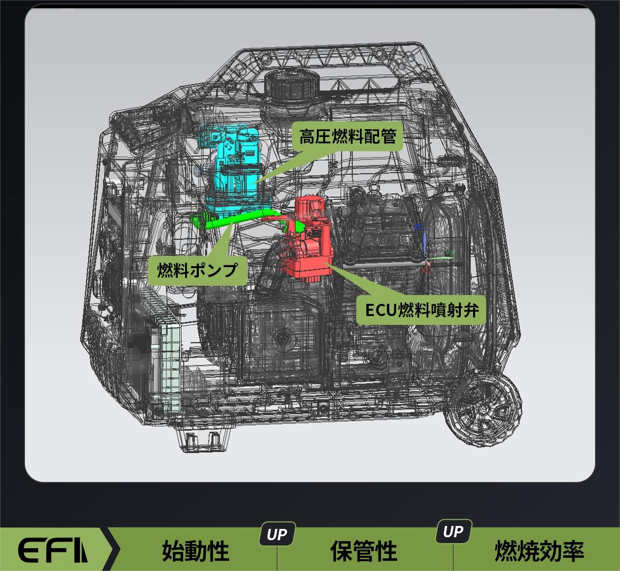 EFI電子制御燃料噴射装置(Electronic Fuel Injection=EFI)の採用により、チョーク操作を必要としない簡単始動を実現しまして、仕事に、非常時に、頼もしさを発揮します。