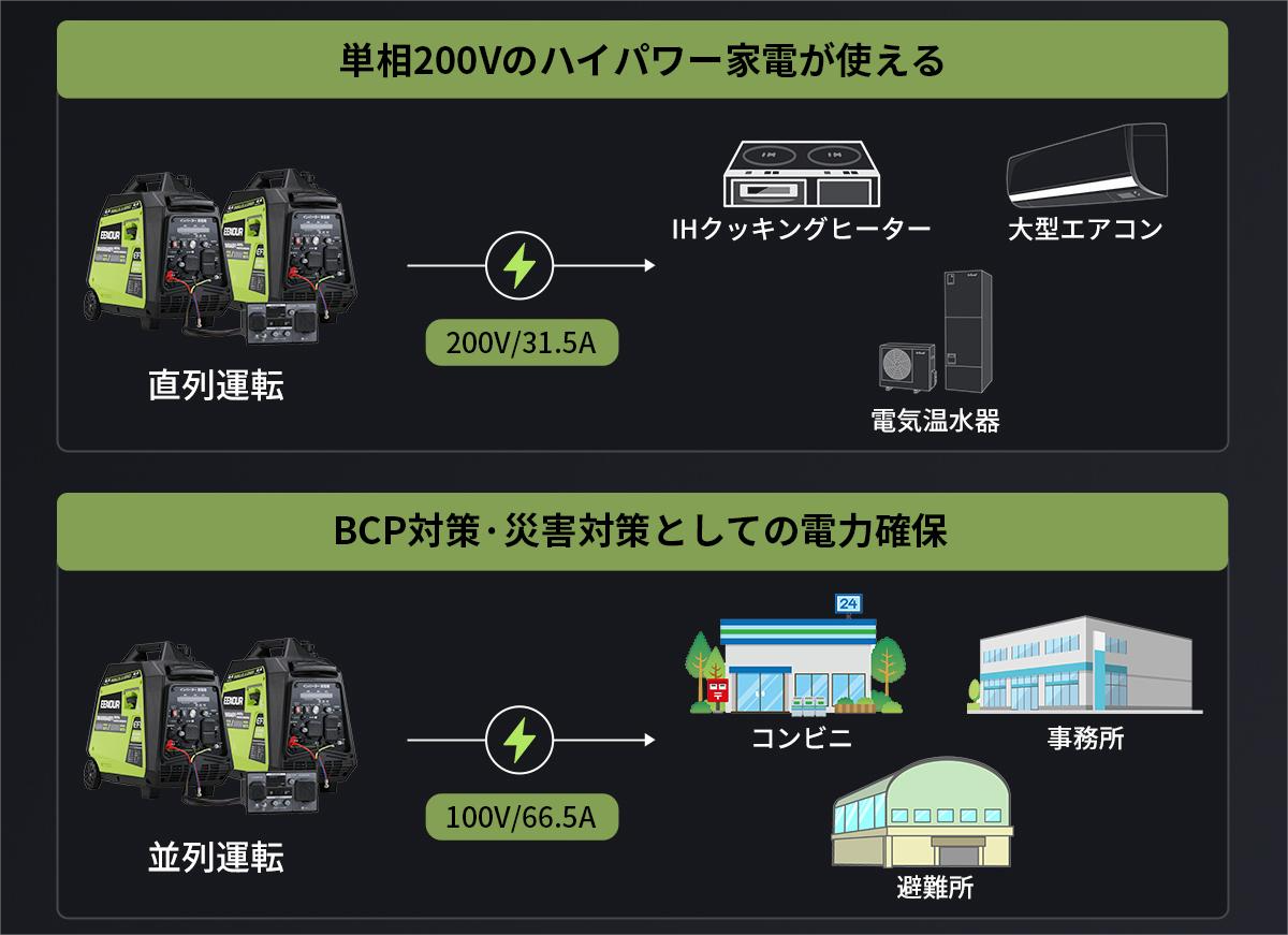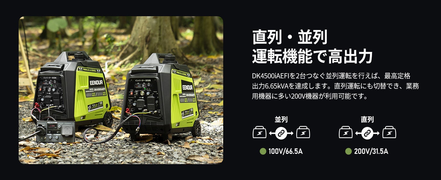 並列/直列運転接続ボックスで2台直列運転の場合、200V対応&最大6300Wの出力が可能に、溶接機、電子レンジなどパワフル&スピーディーな家電製品が搭載可能になりました。 並列運転の場合、100V対応&最大6650Wの高出力を実現しました。