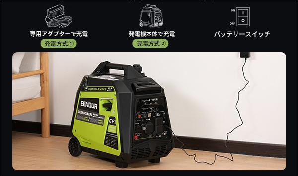 従来のセル起動式発電機より、バッテリーの充電口を増設しました。長期保管、またはバッテリーが上がった場合、指定仕様のACアタブターでバッテリーを充電することが可能になりました。更にバッテリー電量が0%になっても、リコイルスターターで起動可能な機能も付いております。バッテリーの電量がなくなり、作業ができなくなる心配は解消しました。