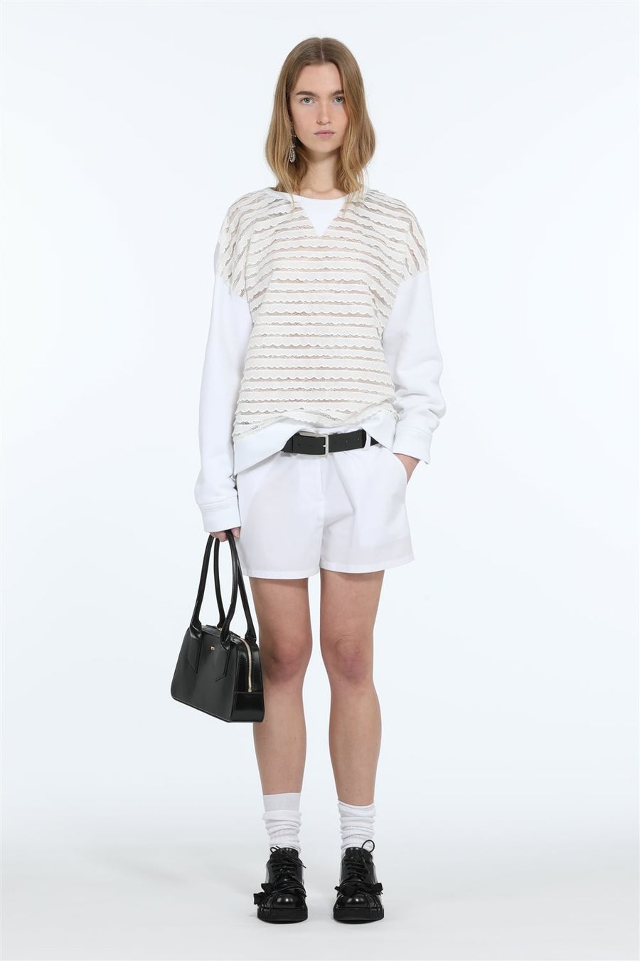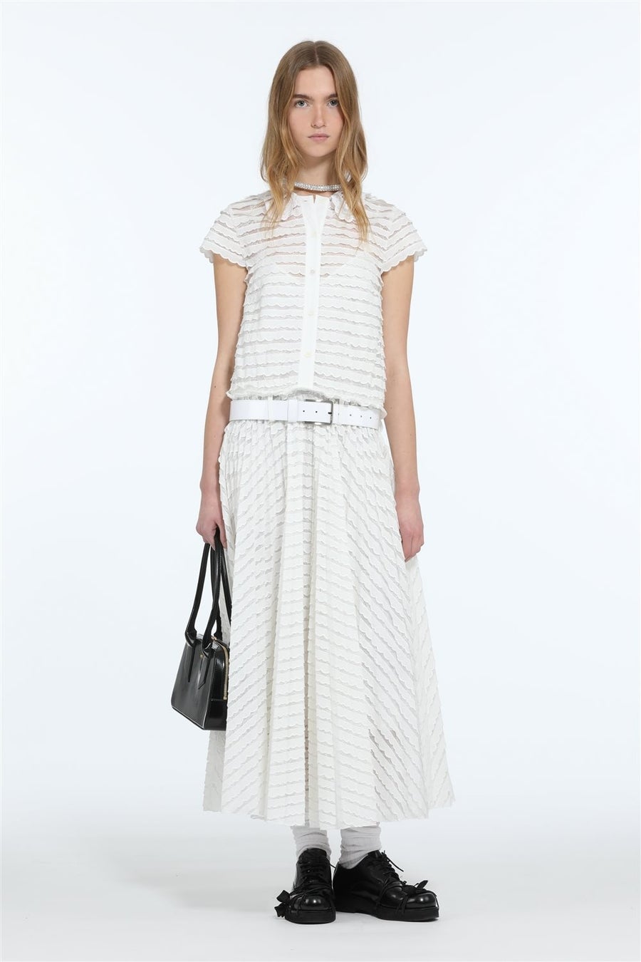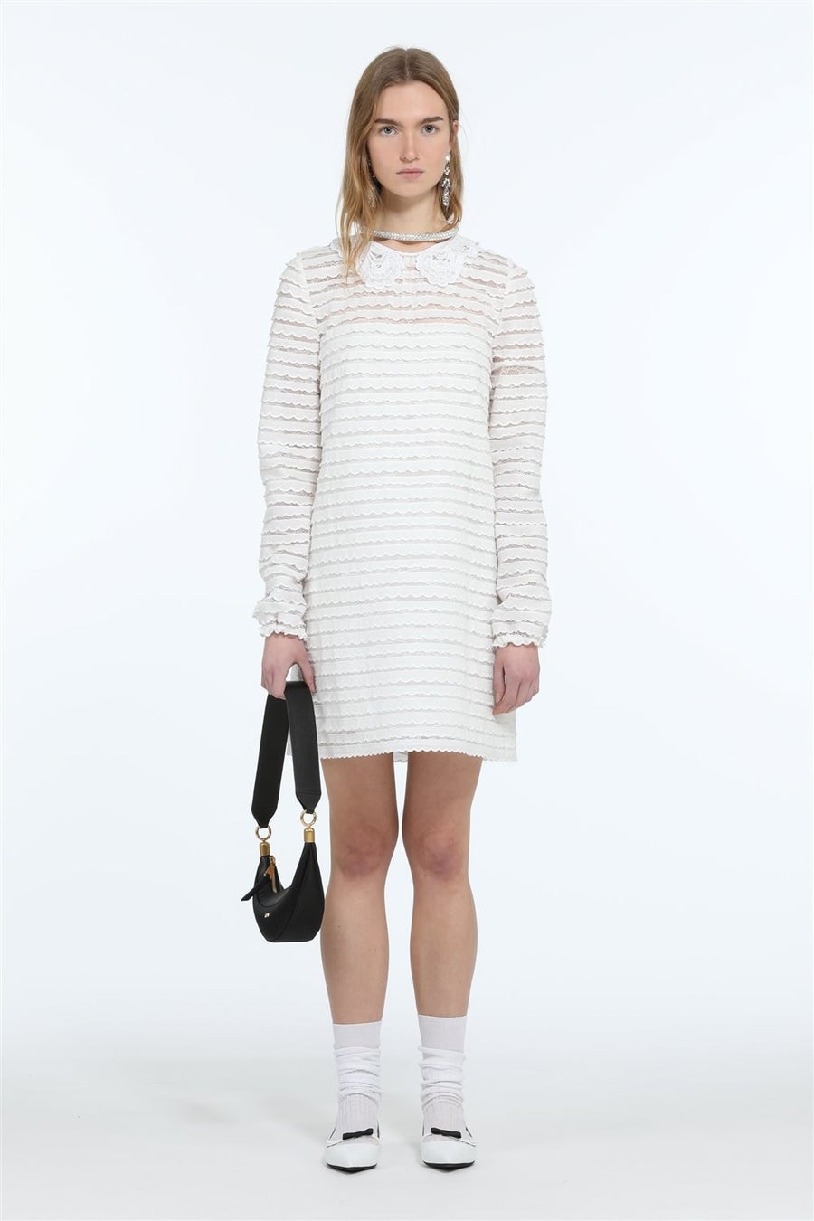 精巧なレース使いとテクスチャーニットでこのトレンドを独自に解釈。特にレース装飾が施された白いドレスは、ピュアなフェミニティとモダンなシルエットが絶妙に調和した逸品。オフィスからオケージョンまで洗練された印象をもたらしてくれます。