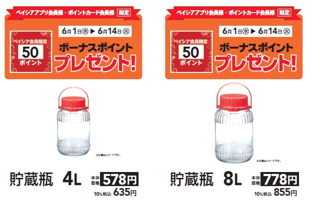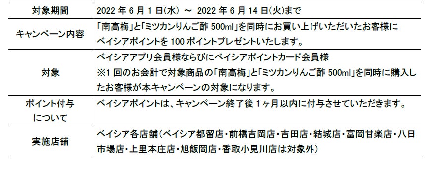 毎年梅仕事を楽しみにしている方はもとより、初めての方でも「梅仕事」を始めやすいように、「梅仕事」にぴったりなアイテムを対象にベイシアポイントと連動したキャンペーンを実施します。この機会に「梅仕事」を楽しんでみてはいかがでしょうか。