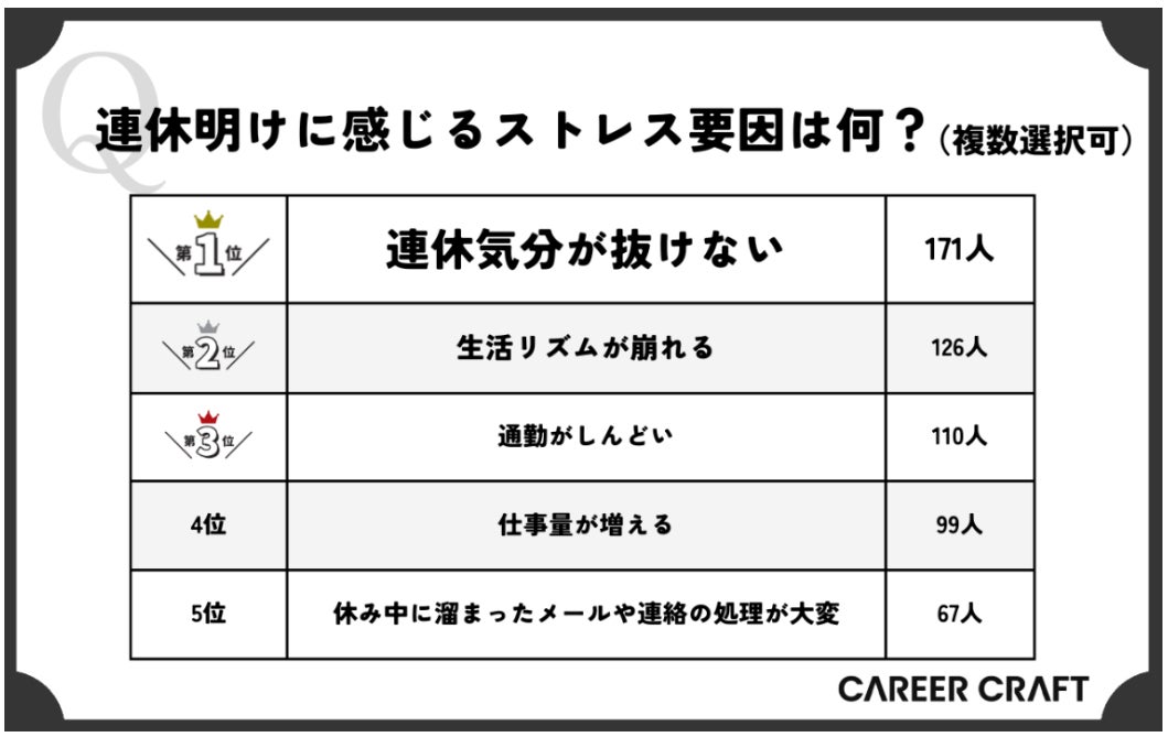 連休明けに感じるストレス要因の1位は「連休気分が抜けない」(171人)でした。