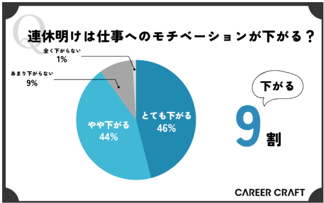 楽しかった時間の余韻が残る一方で、仕事へのやる気が湧かず「もっと休みたい」と感じることもあるでしょう。実際、9割の社会人が「連休明けは仕事のモチベーションが下がる」と答えています。