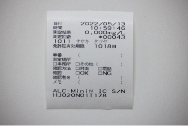 アルコールチェックの記録保存業務がラクになる!測定後に自動で出てくる用紙に管理者がサインか押印すれば完了に!