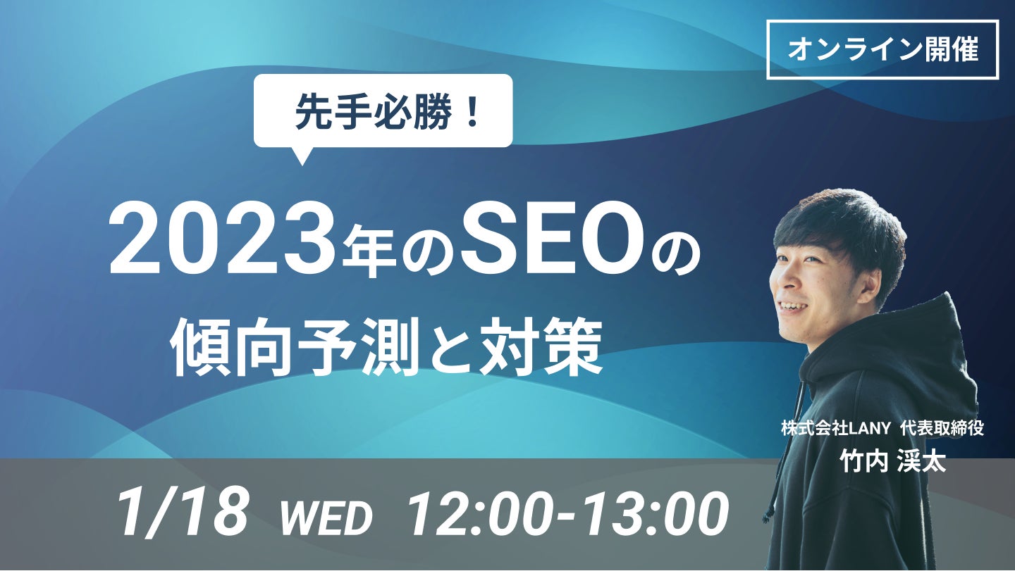デジタルマーケティング支援を提供する株式会社LANY(東京都渋谷区、代表取締役社長:竹内渓太)は、【無料ウェビナー】 先手必勝! 2023年のSEOの傾向予測と対策を行うウェビナーを1/18(水)に開催いたします。