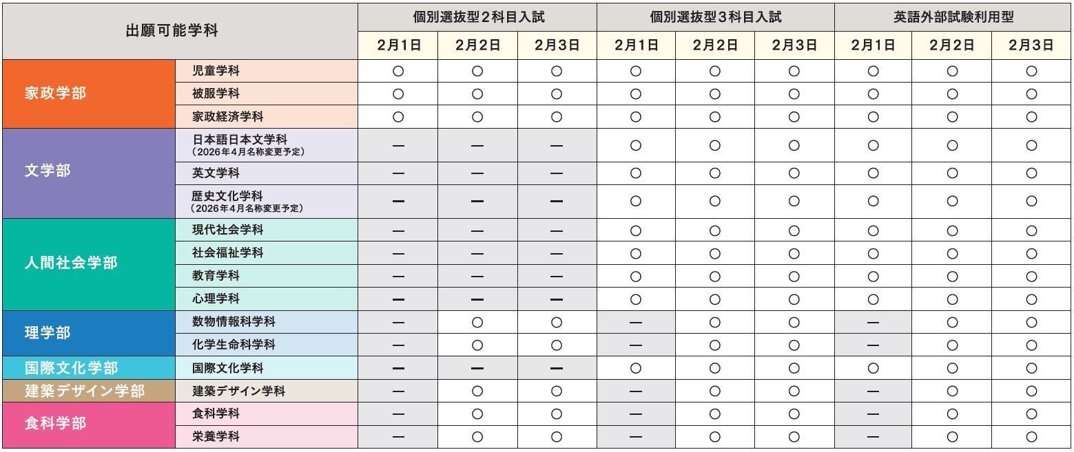 2026年2月1日(日)、2月2日(月)、2月3日(火)に行われる一般選抜(個別選抜型・英語外部試験利用型)において、同学部・学科でも3日まで(理学部、建築デザイン学部、食科学部は2日まで)受験が可能となります。個別選抜型(2科目入試、3科目入試)および英語外部試験利用型では、選択科目が合致すれば複数の併願ができるため、家政学部では最大で9つの合否判定を得ることができます。