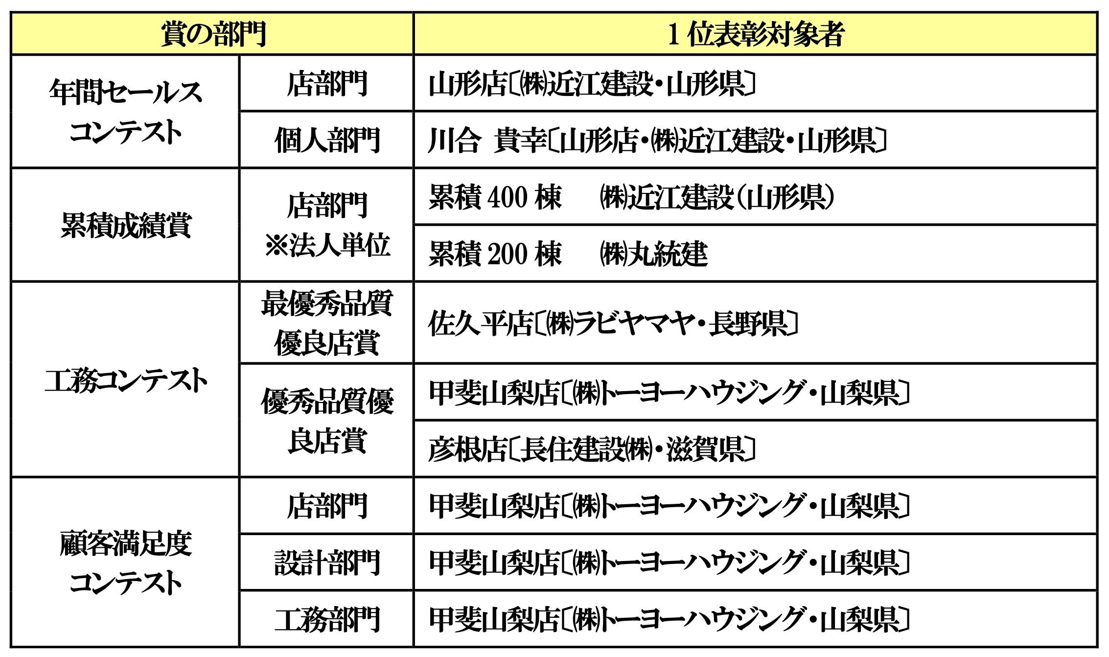 年間セールスコンテストの個人部門での1位は、山形店の川合さんで、3年連続での1位受賞となり、フィアスホームでは初の快挙となりました。年間セールスコンテスト(店部門)の第1位には、昨年に引き続き、フィアスホーム山形店が受賞しました。なお、2022年度の各種コンテストの受賞者・受賞店は次頁の通りです。