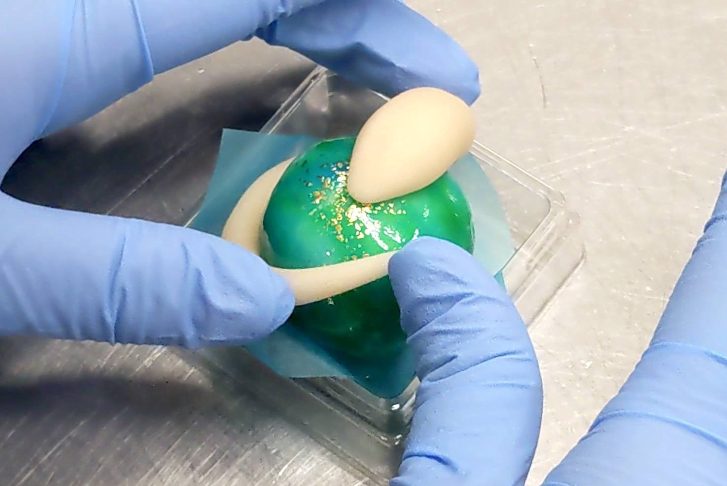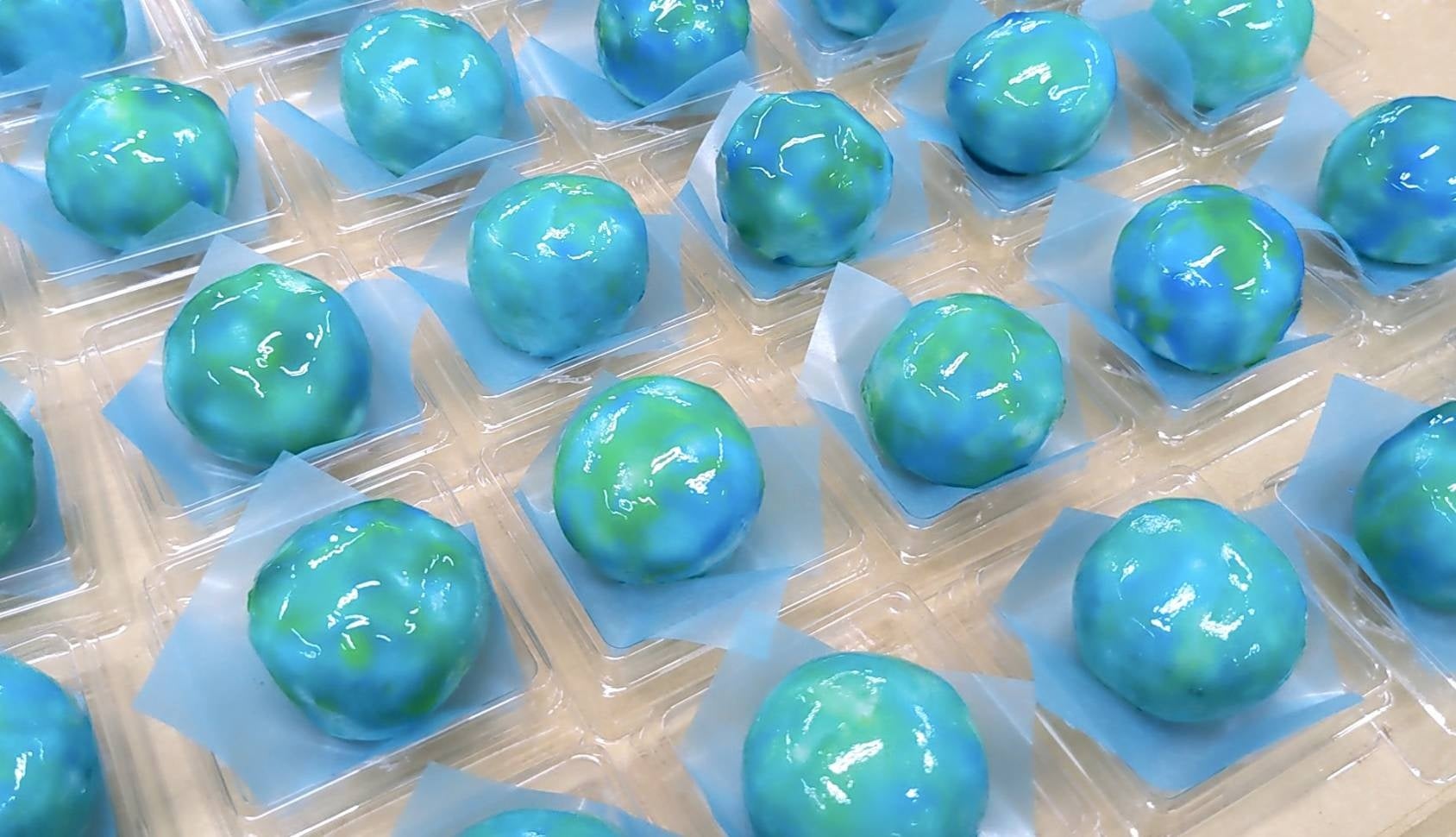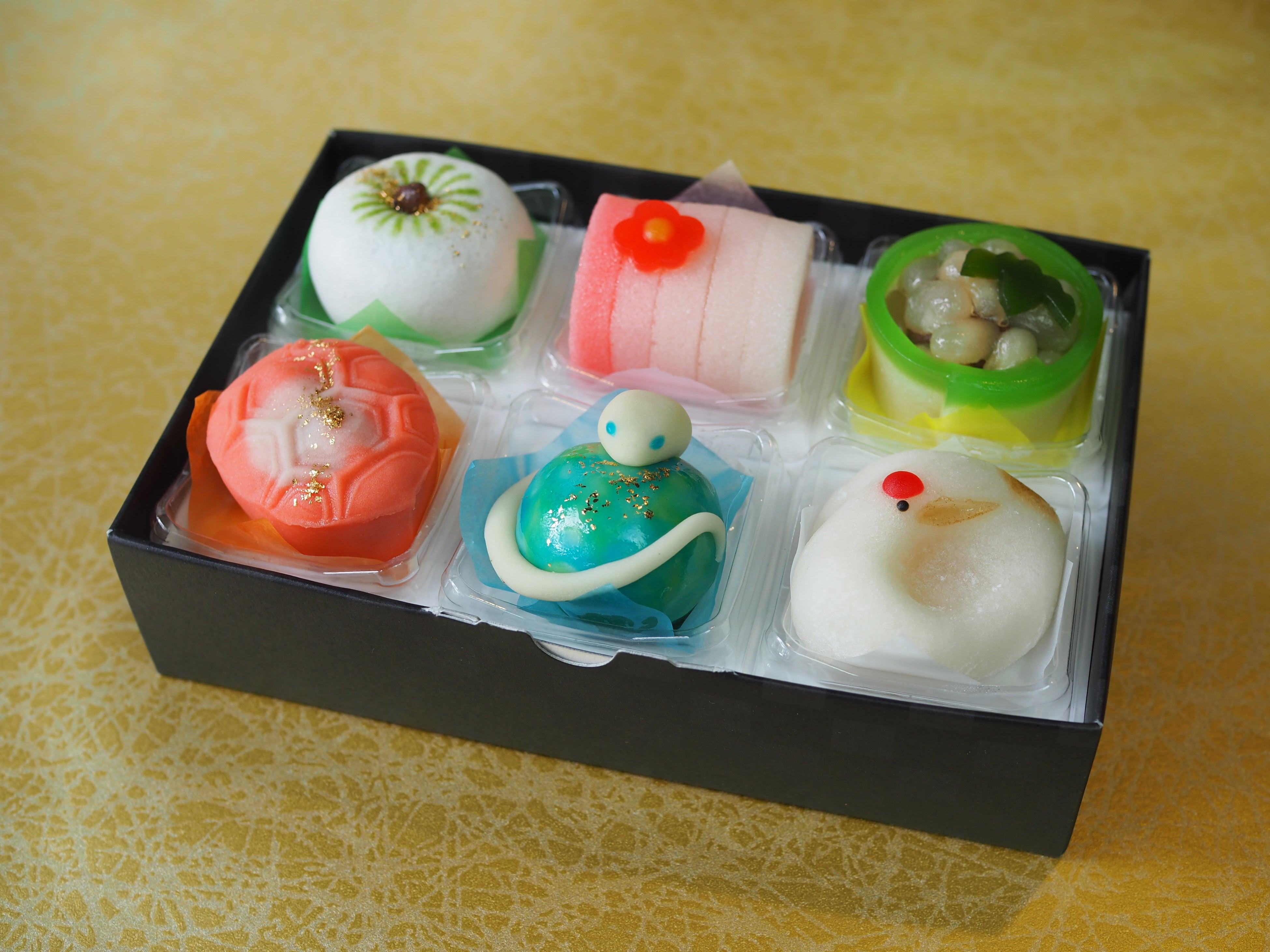 ・宝玉は自社独自の製法により錦玉羹(寒天に砂糖を入れて煮詰めたもの)でターコイズ石をイメージした水色と緑色の光沢感のあるマーブル模様に着色し、仕上げに金箔を散らしています。