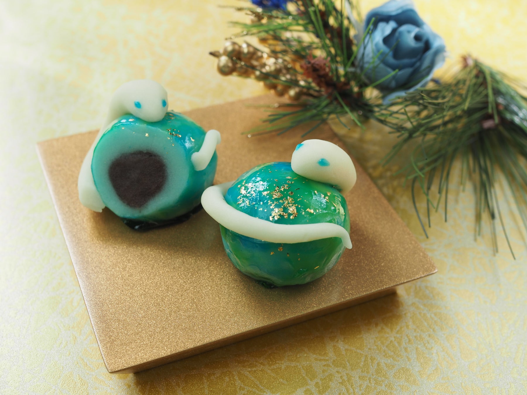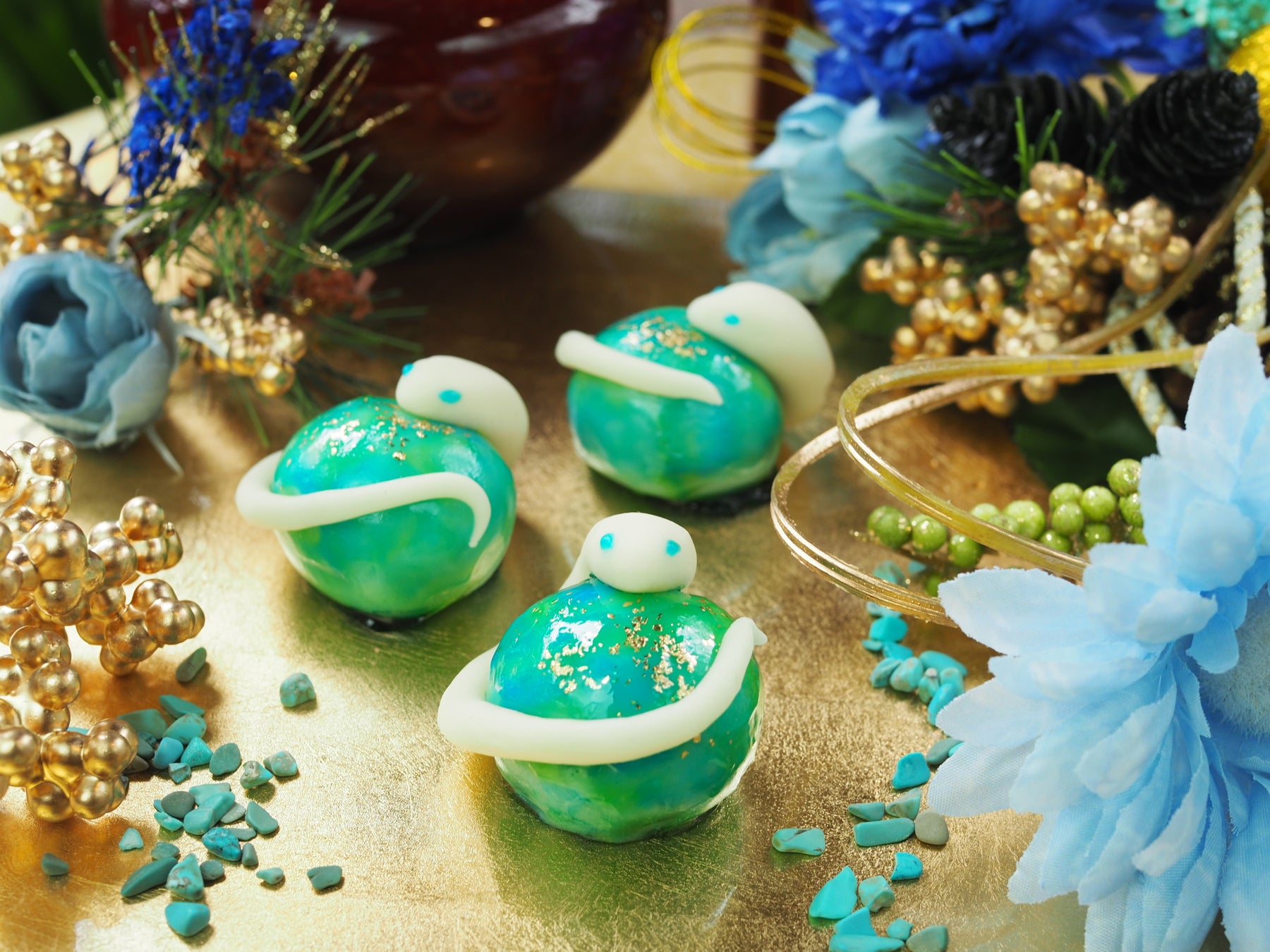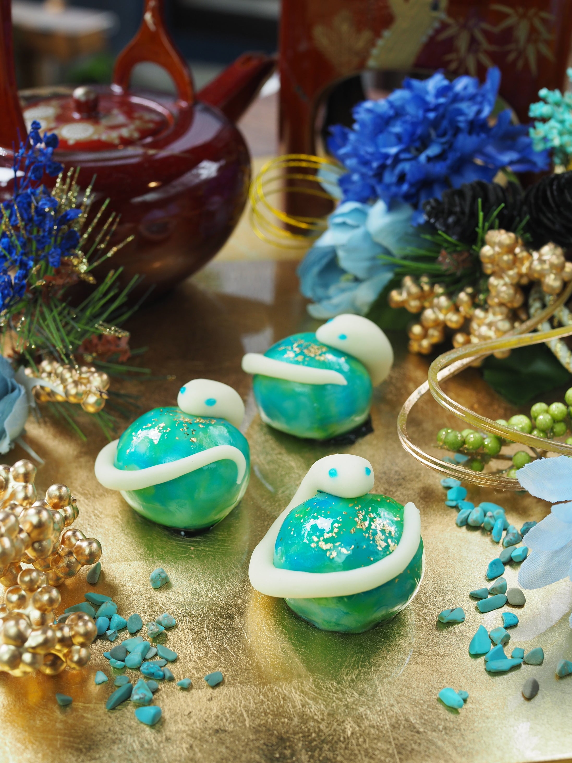 ・蛇は「気持ち悪い」「怖い」などの不のイメージ姿を思い描いてしまいがちですが、女性和菓子デザイナーならではの神秘的なデザインになっています。