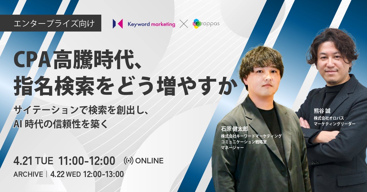 SEO/LLMOツール「パスカル」の開発・提供を行う株式会社オロパスは、2026年4月21日(火)に、CPAが高騰している昨今、指名検索をどの様に増やしていくかをテーマにしたウェビナー、『エンタープライズ向け|CPA高騰時代、指名検索をどう増やすか〜サイテーションで検索を創出し、AI時代の信頼性を築く〜』を開催いたします。