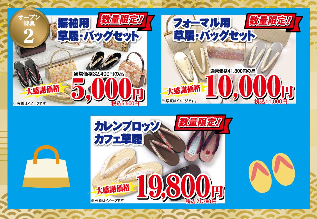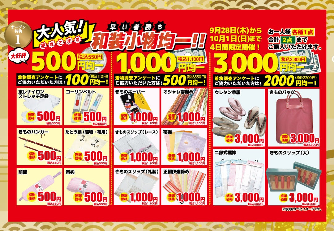 オープン記念として、9月28日(木)~10月9日(祝月)の期間、和装小物均一品などの特典をご用意しました。皆様のご来店お待ちしております。