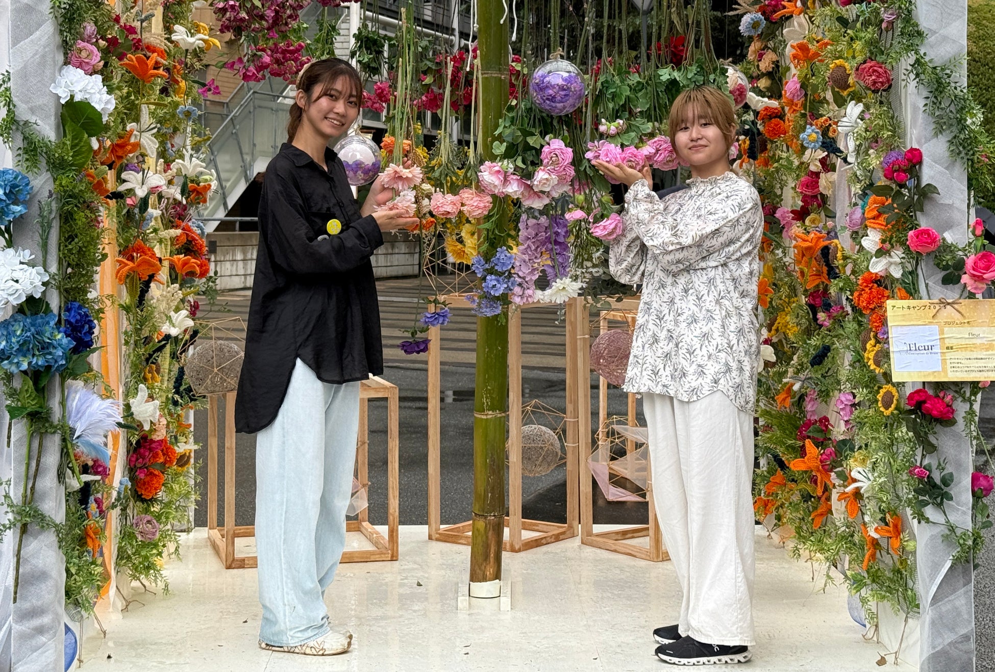 日比谷花壇は、2025年10月4日(土)・5日(日)に開催された東京家政大学造形表現学科主催の「アートキャンプ2025(※)」において、婚礼やイベント装花で使用しているアーティフィシャルフラワー(造花)の貸し出しや、同大学卒業生の社員による技術的な助言を提供し、学生のアイデアを作品として実現するサポートを行いました。その結果、2.4メートル四方の圧巻のインスタレーション「Fleur - Conception de fleurs -」が完成し、大学の正門前が色とりどりの花で彩られました。