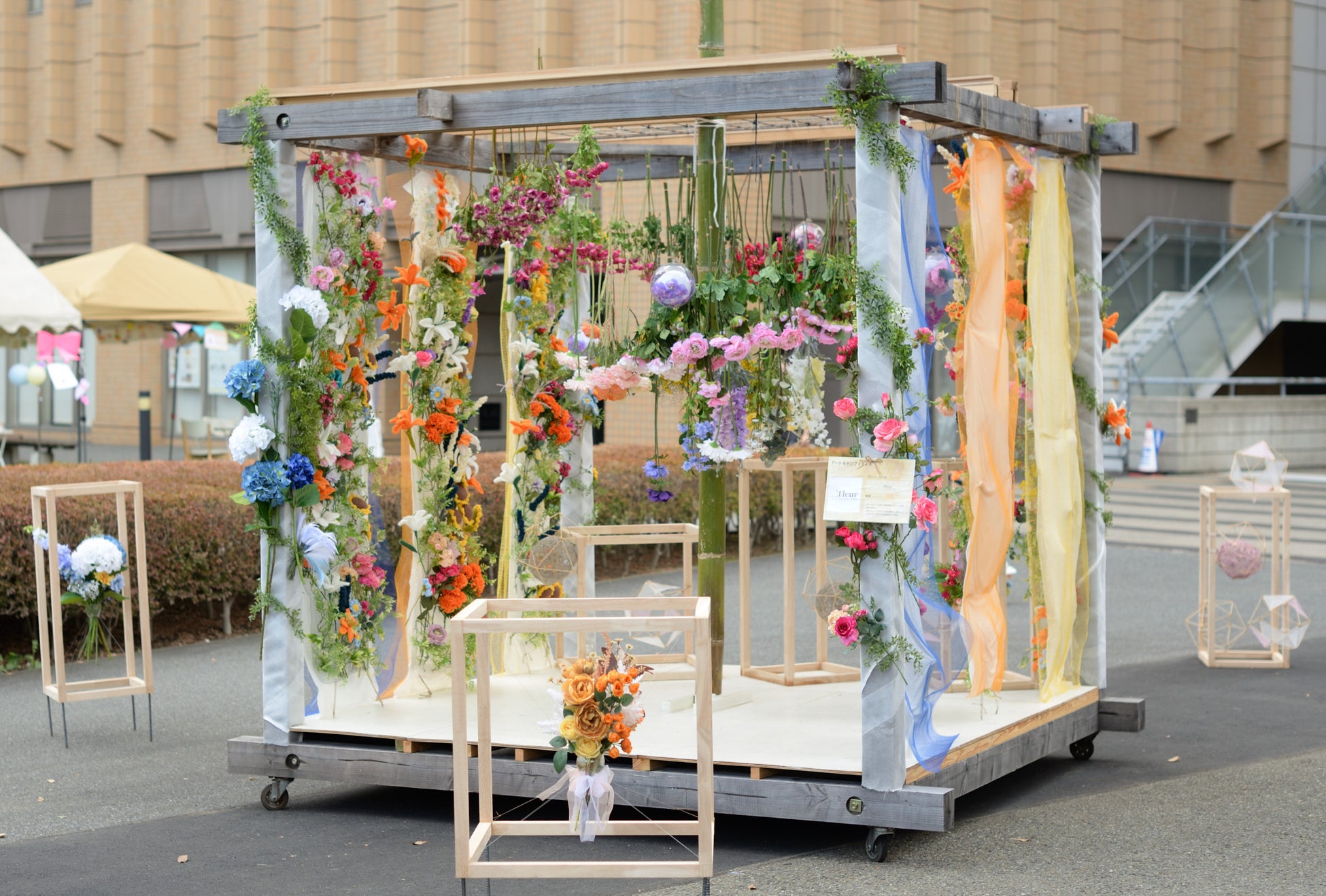 2.4m四方の大きなフレームを活かし、花と緑の非日常的な空間装飾を目指しました。日比谷花壇からお借りした造花はもちろんですが、毛糸を編んで作った造花やリボンを使った造花は7名のチームで制作しています。レースを使った空間づくりをイメージしていたのですが、造花の固定方法や効果的な花の配列の工夫など、日比谷花壇の社員の方のアドバイスで私たちのイメージに近いよりよいものができたと考えています。来場されたお子様やご家族が記念写真を多く撮影してくださいました。正門でお客様をお出迎えし、アートキャンプの会場を盛り上げる素敵なインスタレーションができたと思っています。