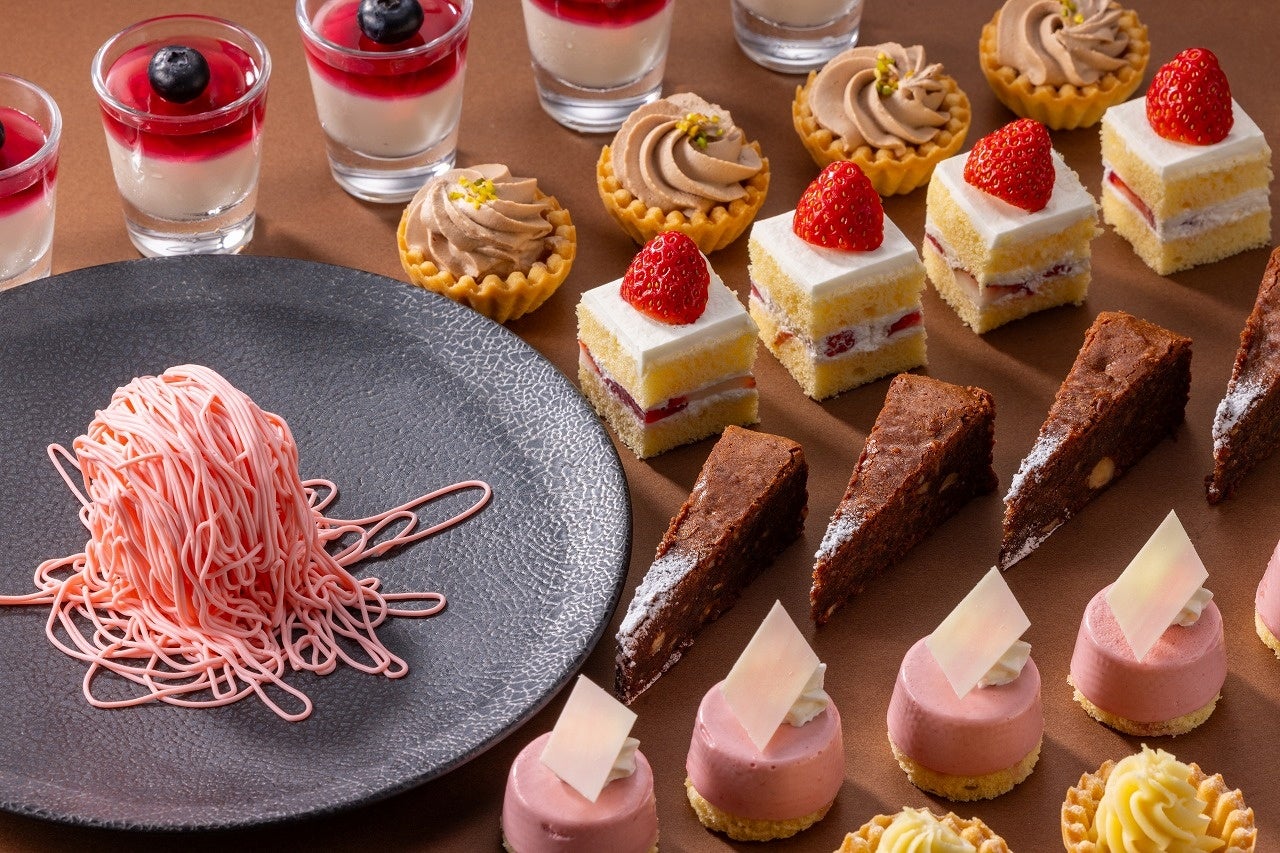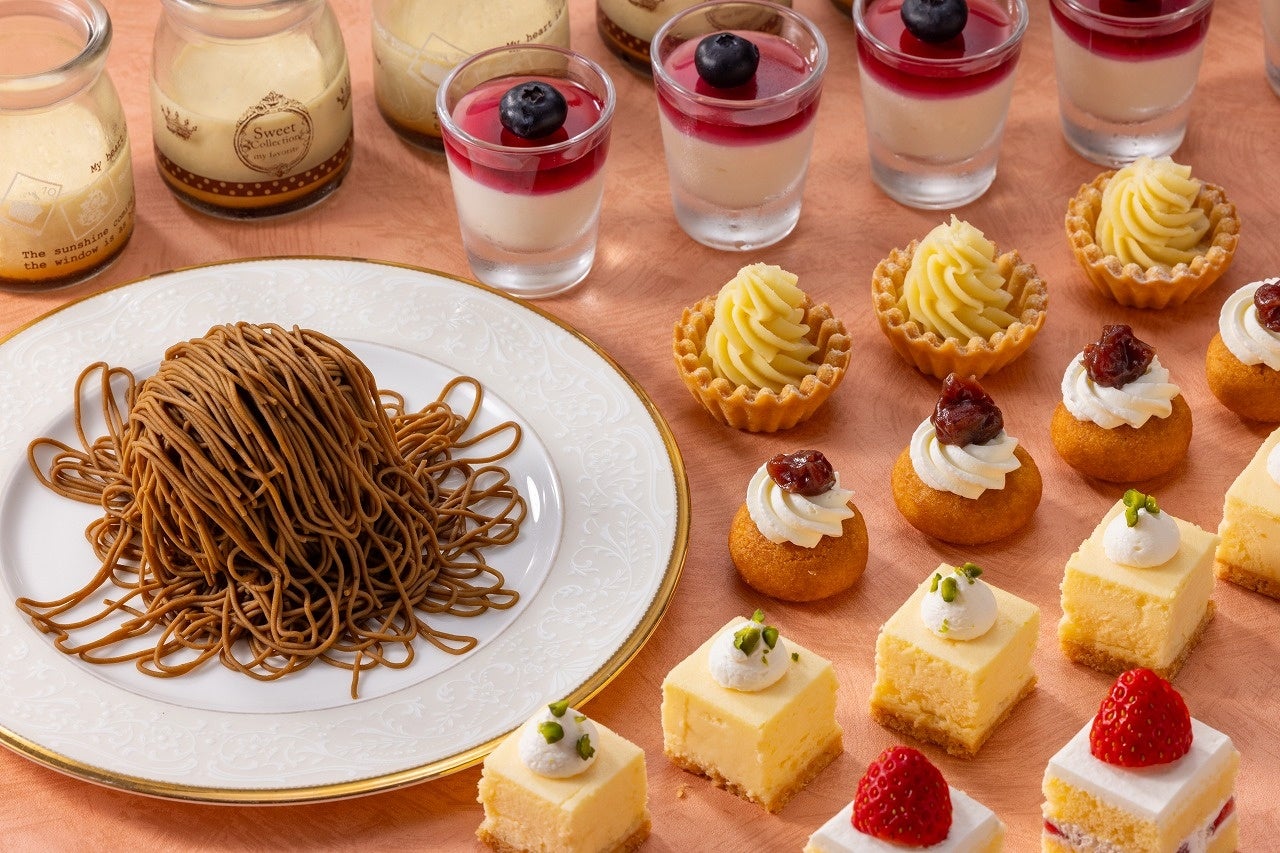 1月11日(土)~1月13日(月・振)、2月22日(土)~2月24日(月・振)の3連休はデザートが充実!目の前で絞って仕上げるモンブランは、1月「ほうじ茶モンブラン」、2月「ストロベリーモンブラン」が月替わりで登場します。日本料理「京都 つる家」の三色大福や抹茶どら焼き、中国料理「梨杏」の杏仁豆腐など他レストランのデザートも一度にお楽しみいただけます。