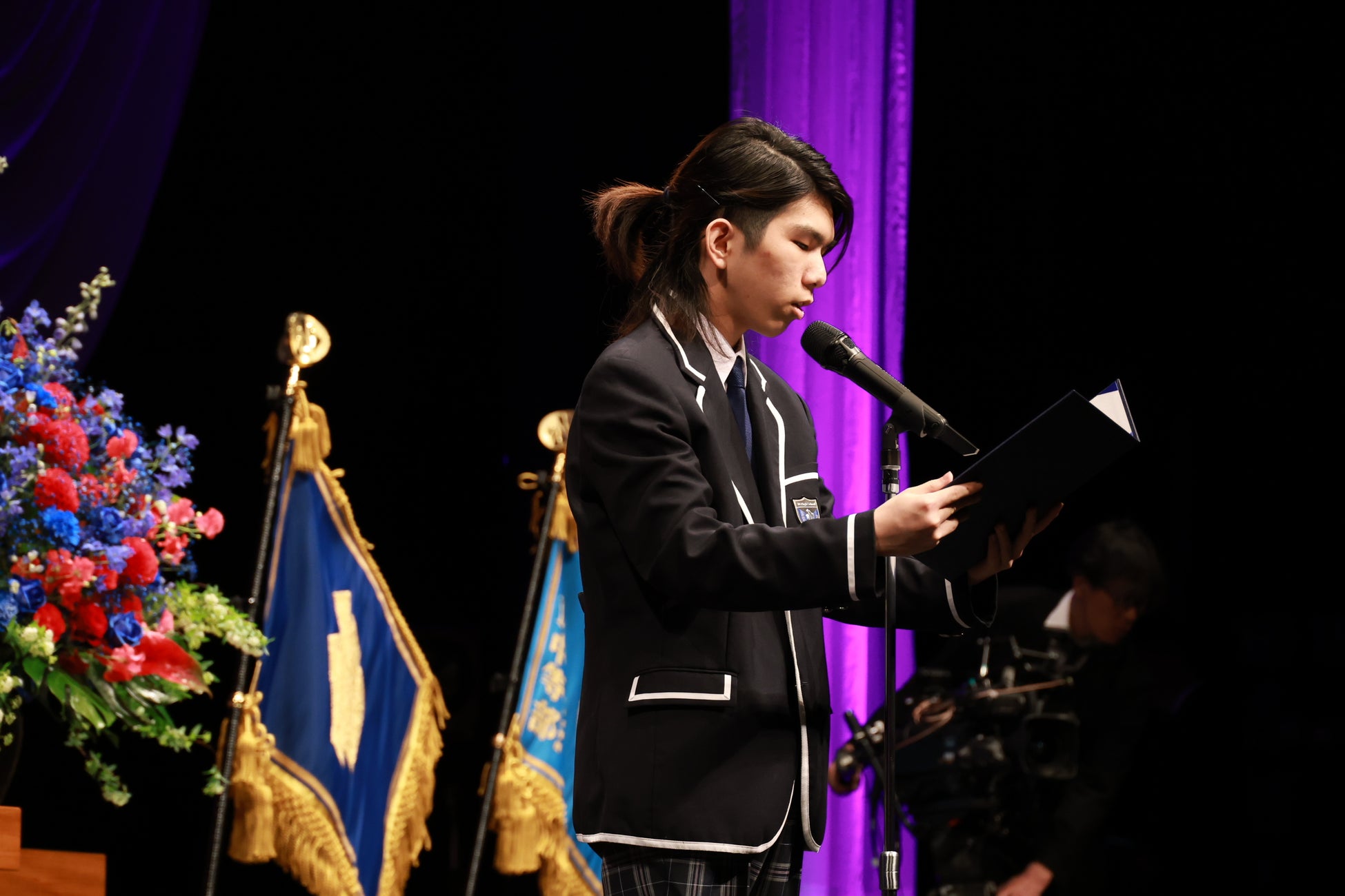 式のフィナーレを彩ったのは、生徒たちの清らかな歌声による「校歌メドレー」です。N高等学校校歌、N中等部スクールソングの『代数Nの方程式』、S高等学校校歌『夢で描けば』、そしてN高グループ校歌『幾千のつばさ』の3曲をメドレーで斉唱。各曲の1番は、在校生・卒業生の有志8名が、堂々としたソロパフォーマンスを披露しました。それぞれの誇りを胸に響かせた歌声は、約1万名の卒業生を代表する力強いエールとなり、新たな門出を鮮やかに祝福しました。