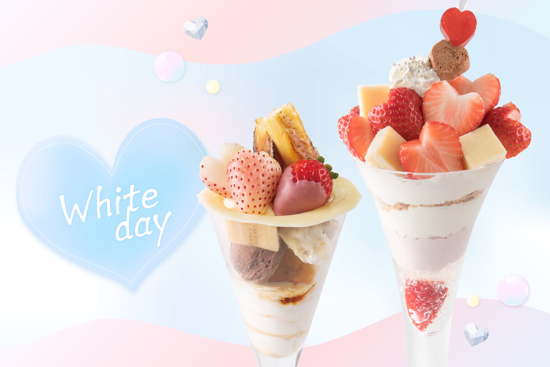 チーズケーキ、ハートの苺アガーゼリーやチョコパルフェもトッピングし、ホワイトデーに華を添えます。