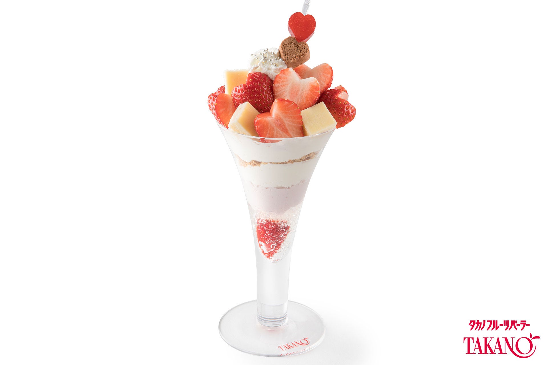 白を基調としたグラスにはソフトクリームや苺ババロアを重ね、華やかな赤色のハート型苺を飾りました。