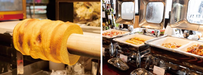 ライブキッチンでは目の前でローストビーフを切り分け、パスタをパルミジャーノレッジャーノで仕上げ、焼きたてのバウムクーヘンもご提供!