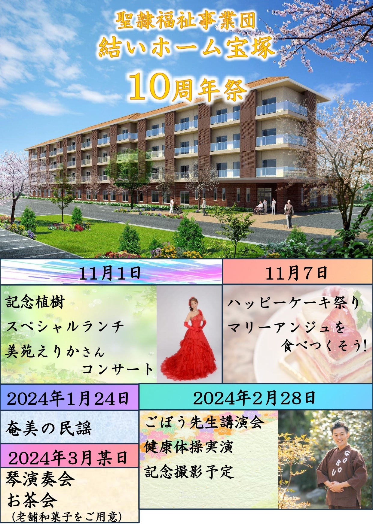 11月1日10:00より、10周年記念の植樹と元宝塚歌劇団美苑えりかさんによる記念コンサートを行います。10周年を彩る華やかな衣装とご入居者が喜ばれる選曲をお願いしています。
