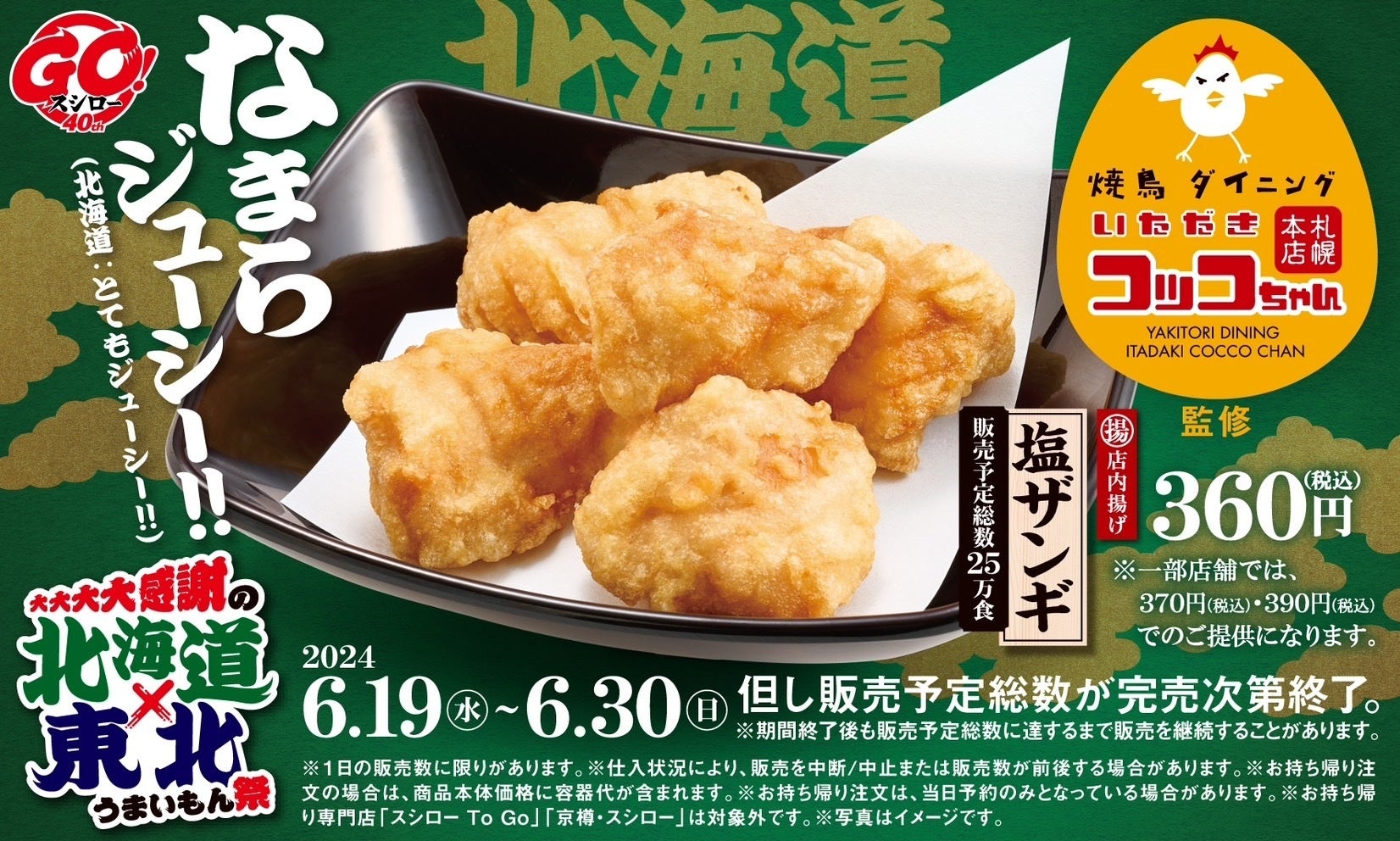 「焼鳥ダイニング いただきコッコちゃん」監修「塩ザンギ」が期間限定で2024年6月19日(水)から全国のスシローデビュー決定!日本唐揚協会全国からあげグランプリ®6年連続金賞受賞の味を楽しんで!
