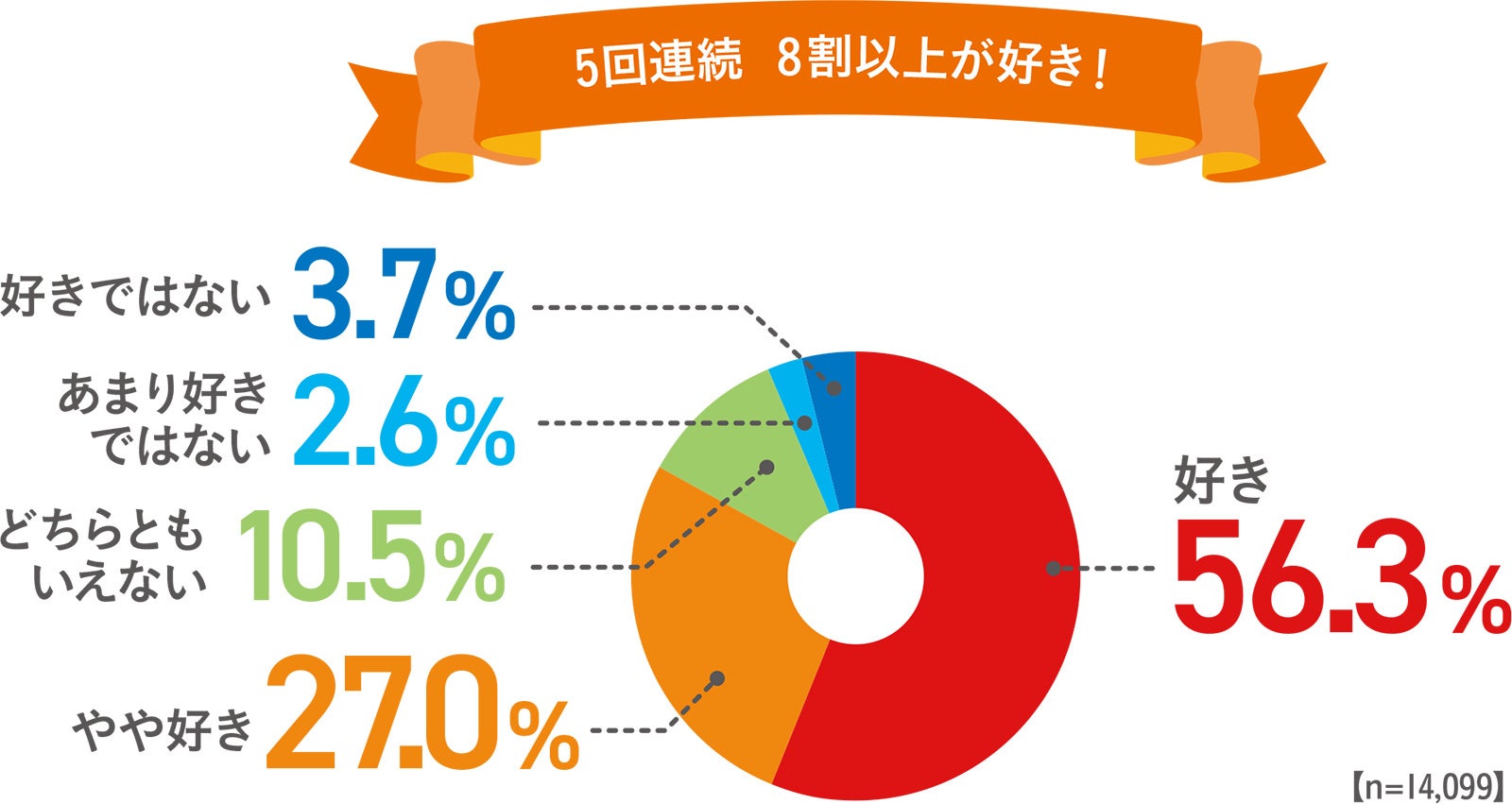 から揚げの好意レベルを聞いたところ、5回連続で8割近くが好きと回答した(「好き(56.3%)」、「やや好き(27.0%)」)。