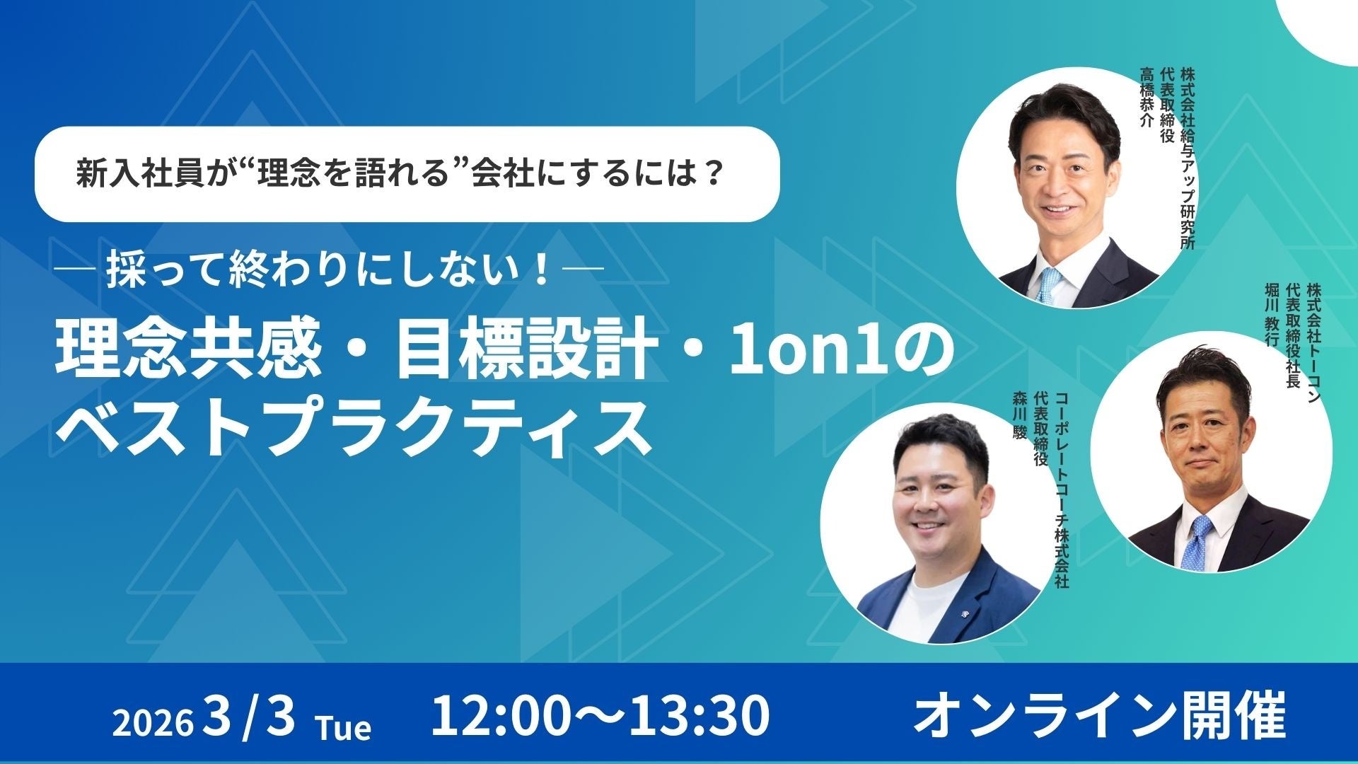 2026年3月3日(火)、株式会社給与アップ研究所(代表取締役:高橋 恭介)は、コーポレートコーチ株式会社(代表取締役:森川 駿)、株式会社トーコン(代表取締役社長:堀川 教行)との3社共催により、「採って終わりにしない!理念共感・目標設計・1on1のベストプラクティス」オンラインセミナーを開催しました。