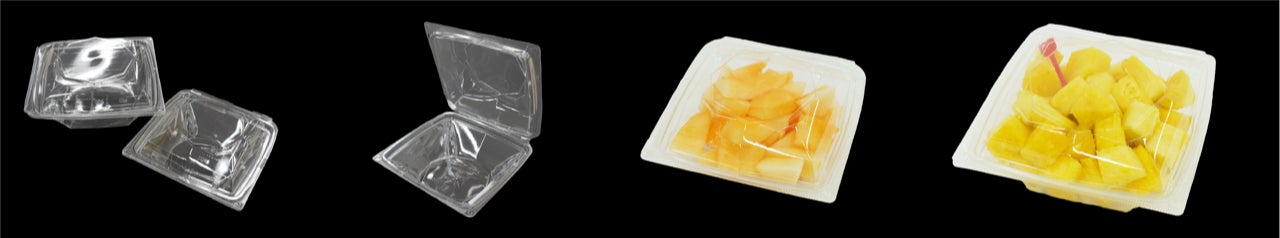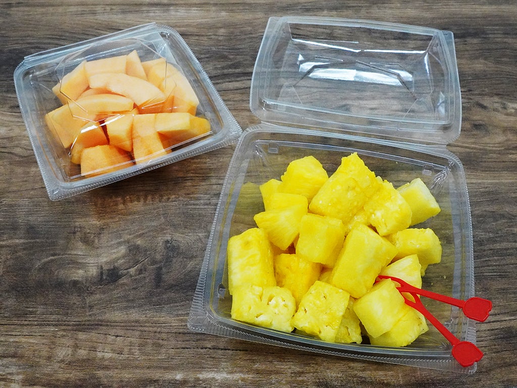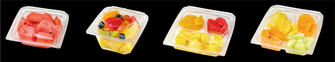 近頃、スーパーの売り場で存在感を増してきているカットフルーツ。カットする手間なく手軽にフルーツが食べられるため人気が高まっています。カットフルーツの販売時にはそのほとんどが本体と蓋が分かれた容器を使用されていますが、別々に梱包されているため在庫スペースが広く必要なこと、あらゆるサイズの本体や蓋を管理する手間、かん合のしずらさなど課題がありました。そこで、本体と蓋が一体で管理が容易な容器の開発に着手。ユーザー様よりご意見をいただきながら、カットフルーツ専用容器「APオクタ」を開発しました。汁漏れがしにくい強い密閉性のあるかん合が大きな特徴です。