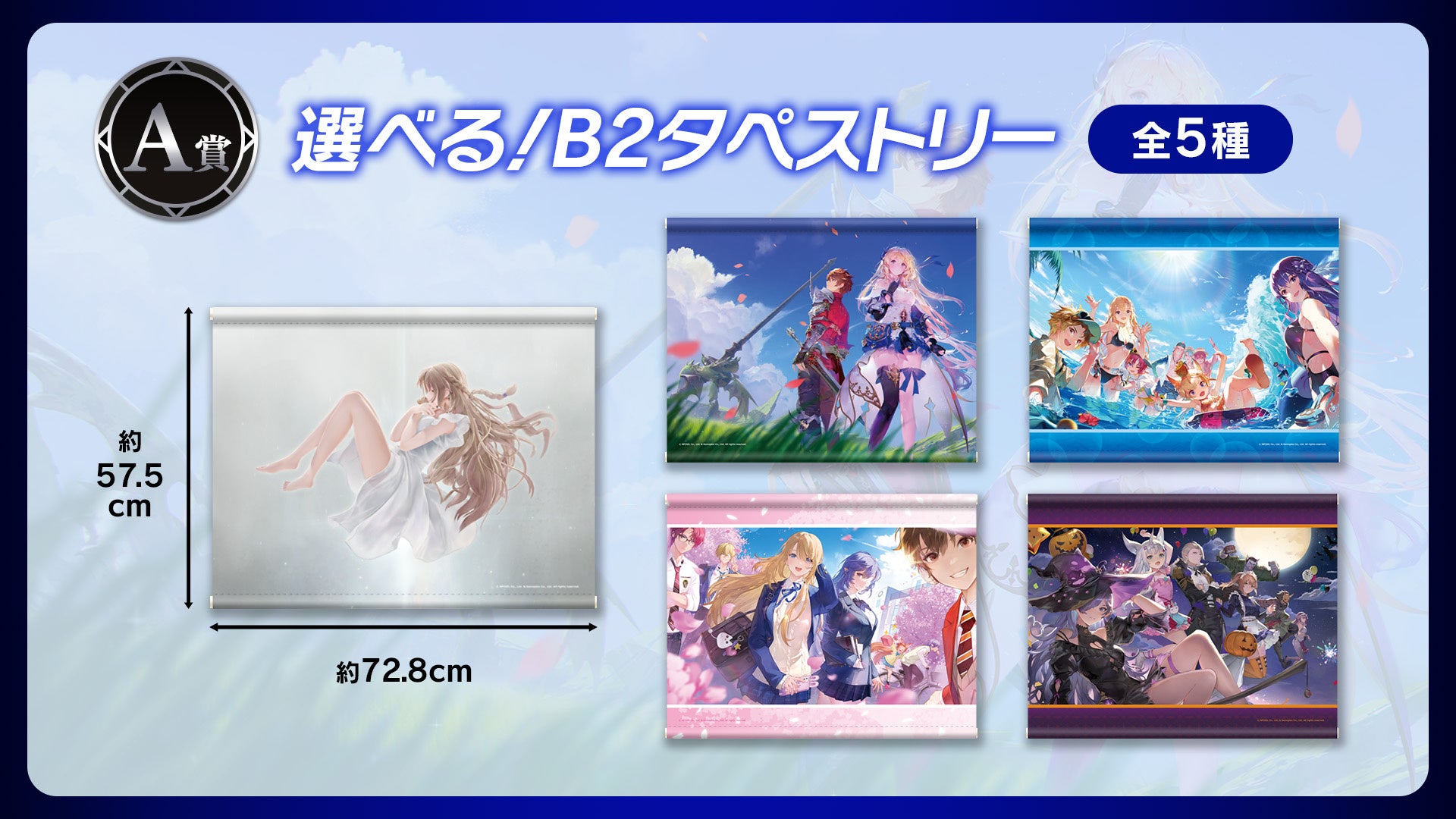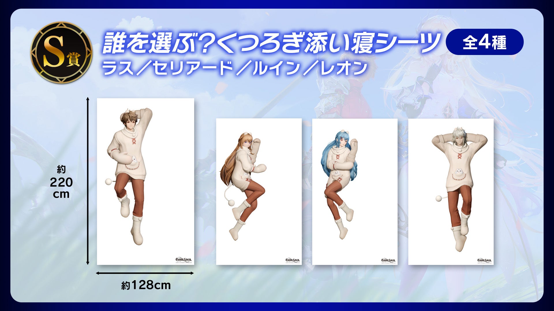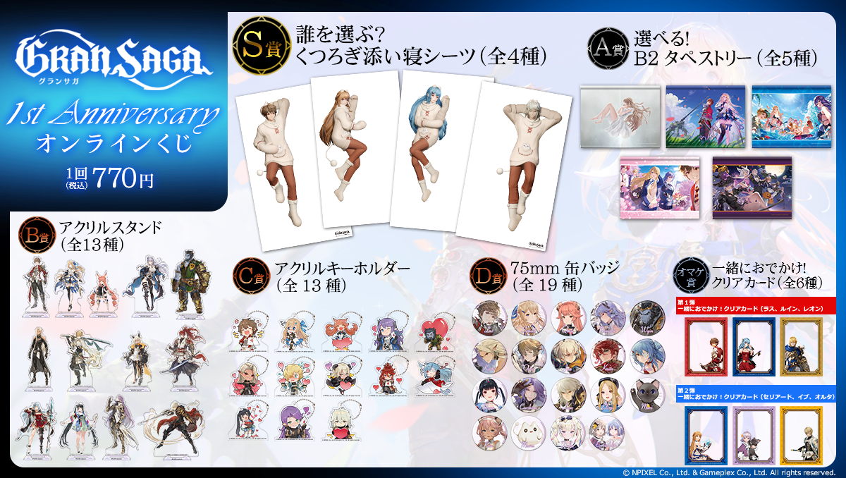 オンラインくじは1回770円(税込)となり、商品にはグランサガのキャラクターとくつろげる「添い寝シーツ」(全4種)をはじめ、リリースから1周年までのキーアートをあしらった「B2タペストリー」(全5種)など、ここでしか手に入らないオリジナルグッズを取り揃えております!
