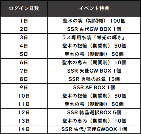 (2).ボーナスアイテムは、聖木の実10個、聖木の記憶10個、 聖木の雫10個です。