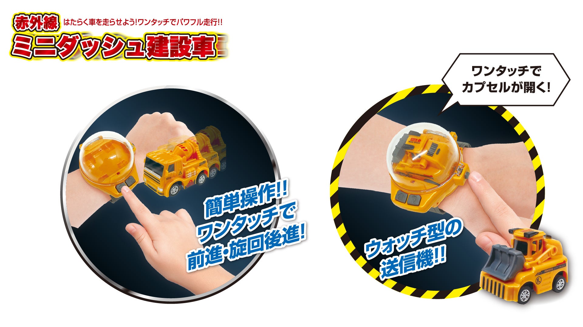 特徴:ウォッチ型送信機で全長5cmのミニ建設車を操ろう!前進・後進・旋回が可能。建設車は「ブルドーザー・ショベルカー・ミキサー車」の3種類。ワンタッチでカプセルが開閉して建設車を送信機内に収納できます。