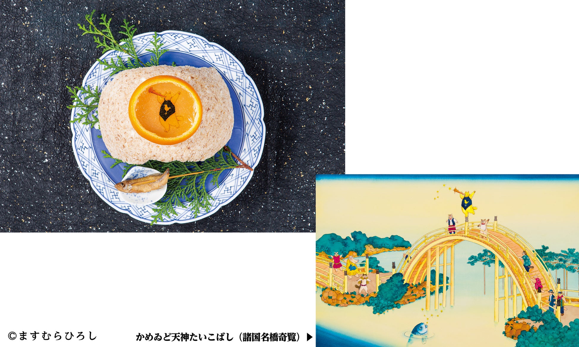 本画集は、空想の世界「アタゴオル」シリーズに登場する立って歩く太った猫「ヒデヨシ」をはじめとする「アタゴオル」の住人たちが、北斎の描く名勝・景勝地に違和感なく溶け込んだユーモアあふれる作品です。「ヒデヨシ」と江戸時代の風景が融合した浮世絵、その一つひとつの作品から物語を読みとり、料理長榎本稔が表現した料理の数々を会席でご用意いたしました。店内には画集から複製数点を展示するほか、「かめゐど天神たいこばし」に描かれている可愛らしい「ヒデヨシ」がプリントされた巾着に、京王プラザホテルの人気の焼き菓子「ミニバウムクーヘン」を詰め合わせたテイクアウト商品も販売し、ますむらひろしと北斎の世界観をたっぷりとご満喫いただけます。