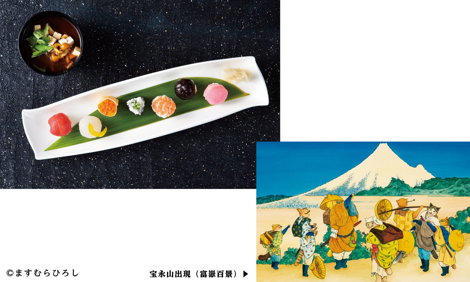 宝永山を前にヒデヨシを中心とした猫たちが集う姿を、可愛らしい七種の手まり鮨に。