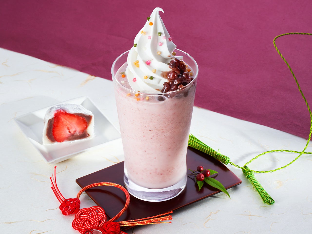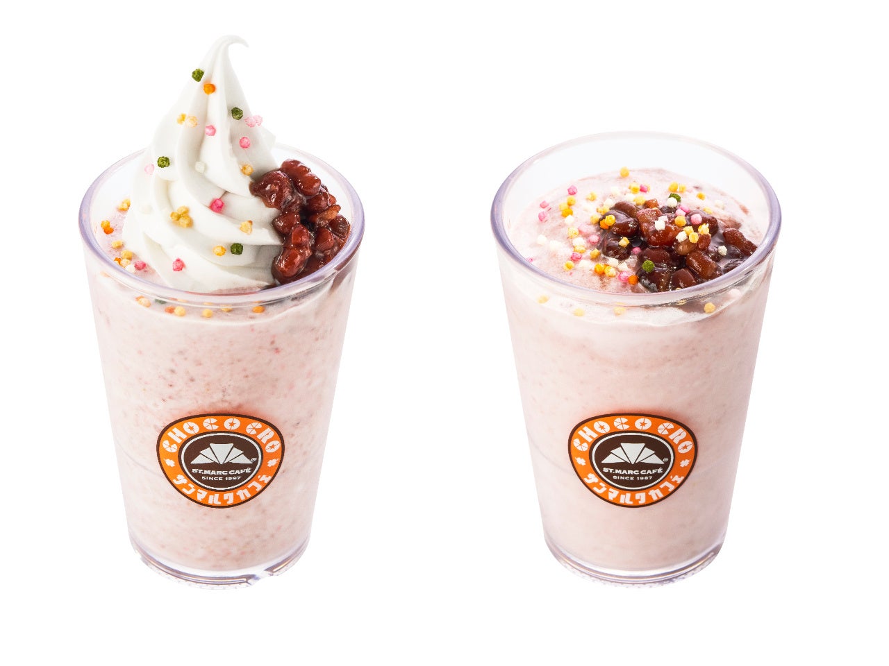 「京いちご大福スムージー~ぶぶあられと京仕立て小豆~」は、いちごの酸味と小豆の上品な甘さ、お餅のもちもち食感が融合し、いちご大福のような味わいをお楽しみいただけるスムージー。煮小豆と京白味噌が織りなす、サンマルクカフェでしか飲むことのできない、京仕立ての味わいを堪能いただけます。