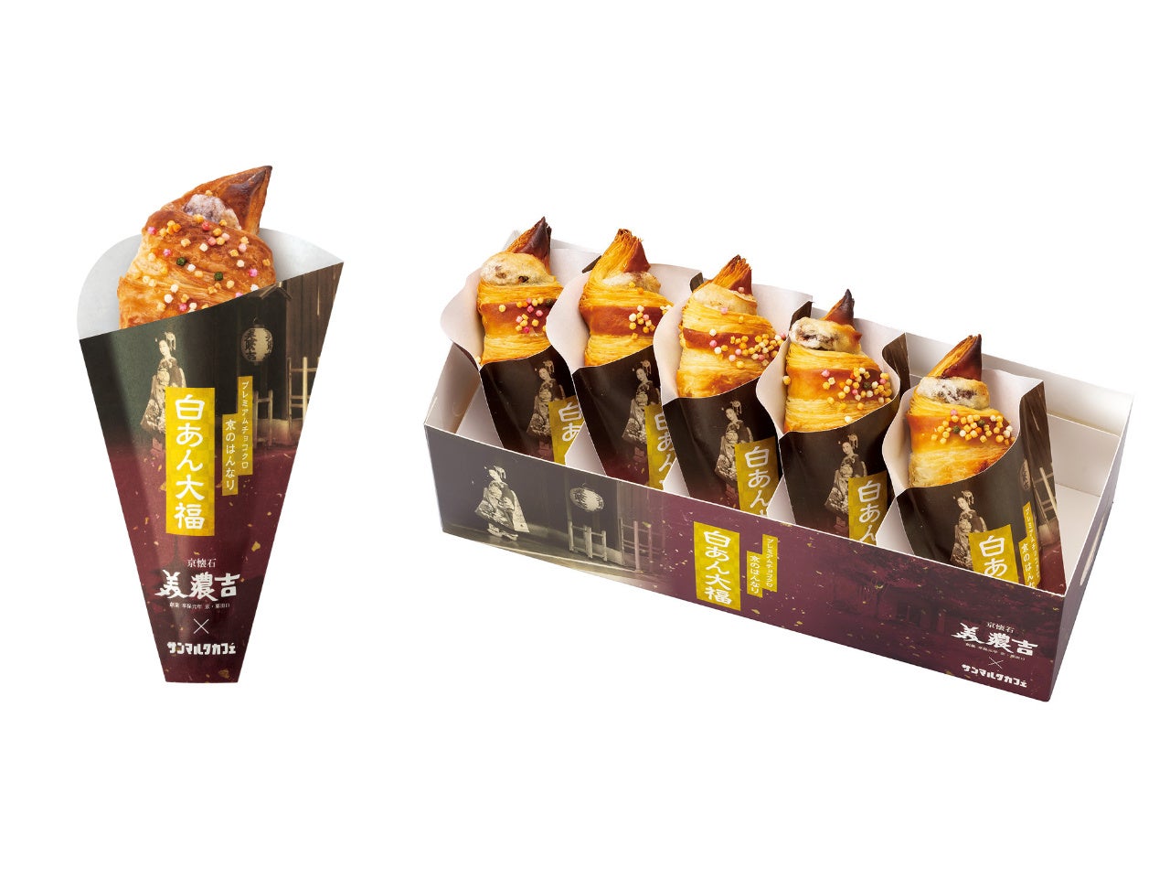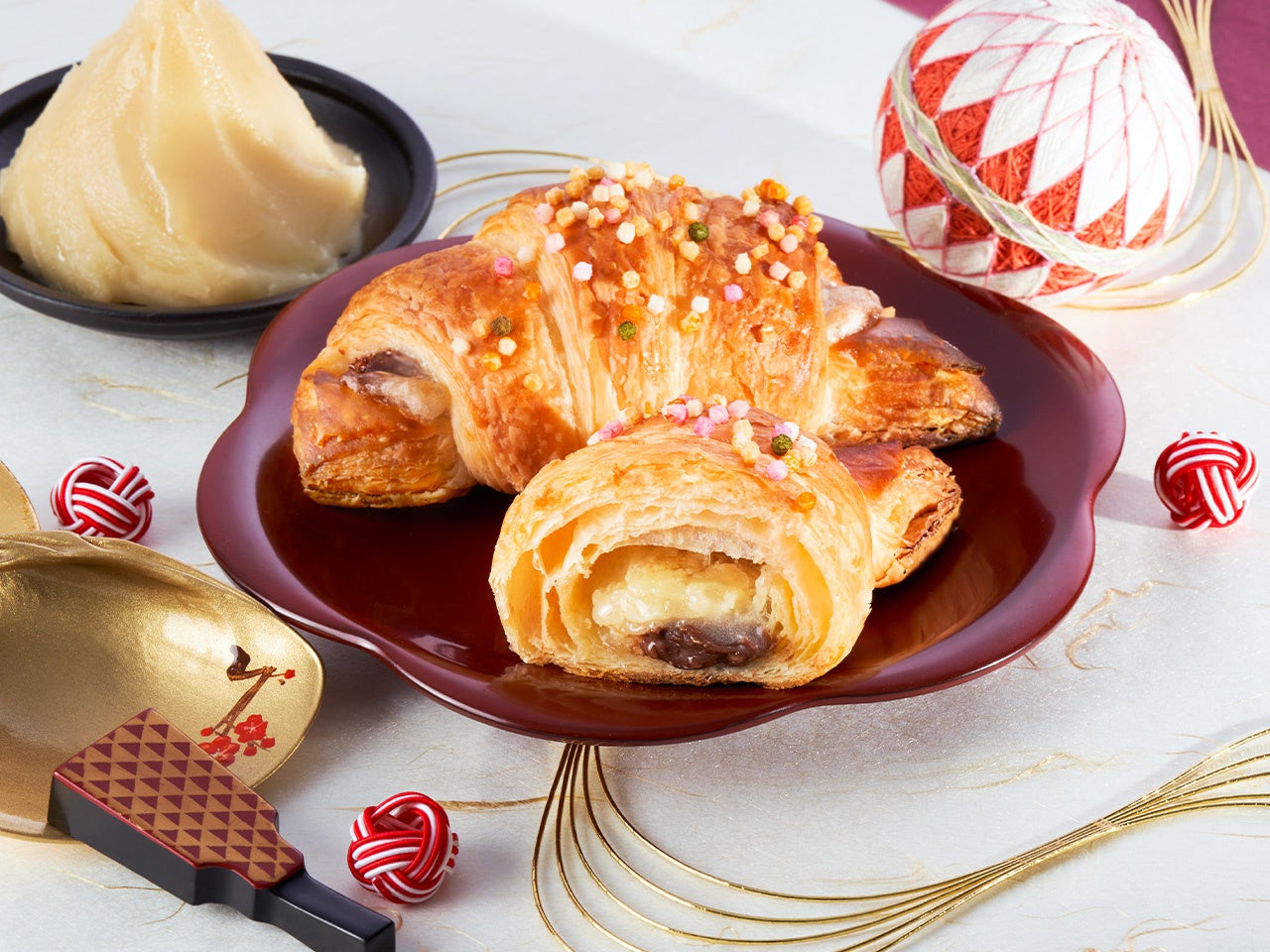 「プレミアムチョコクロ 京のはんなり白あん大福」は、柔らかなおもちを、京白味噌を加えたなめらかな白あんと一緒にクロワッサン生地で包み込み焼き上げた、プレミアムな逸品です。白あんの上品な甘さと京白味噌の塩味があいまった、コクのある甘さに加え、表面のぶぶあられからはカリッとした食感をお楽しみいただけます。「大きな福」を招くよう願いをこめた、お正月にぴったりの商品です。